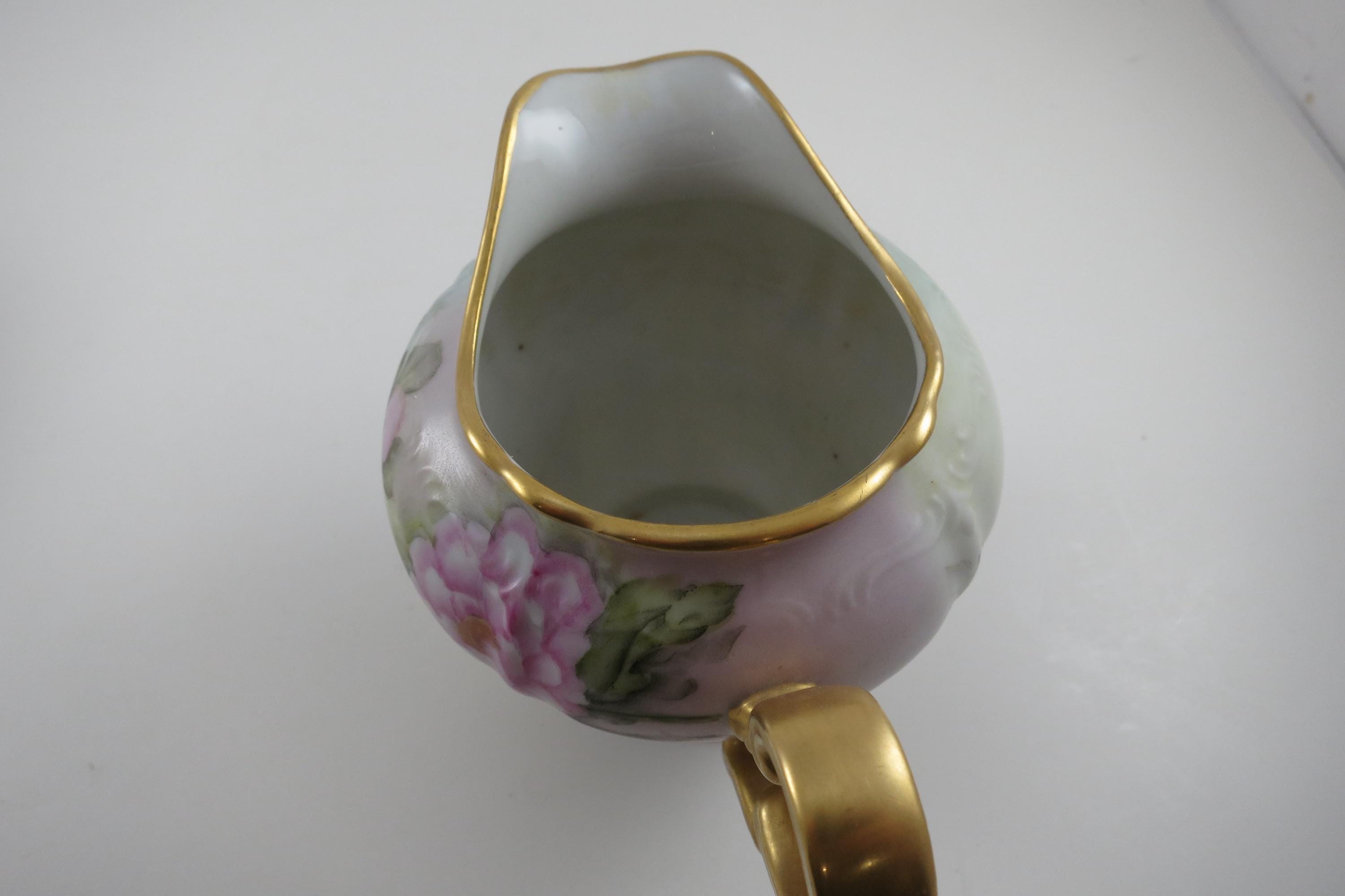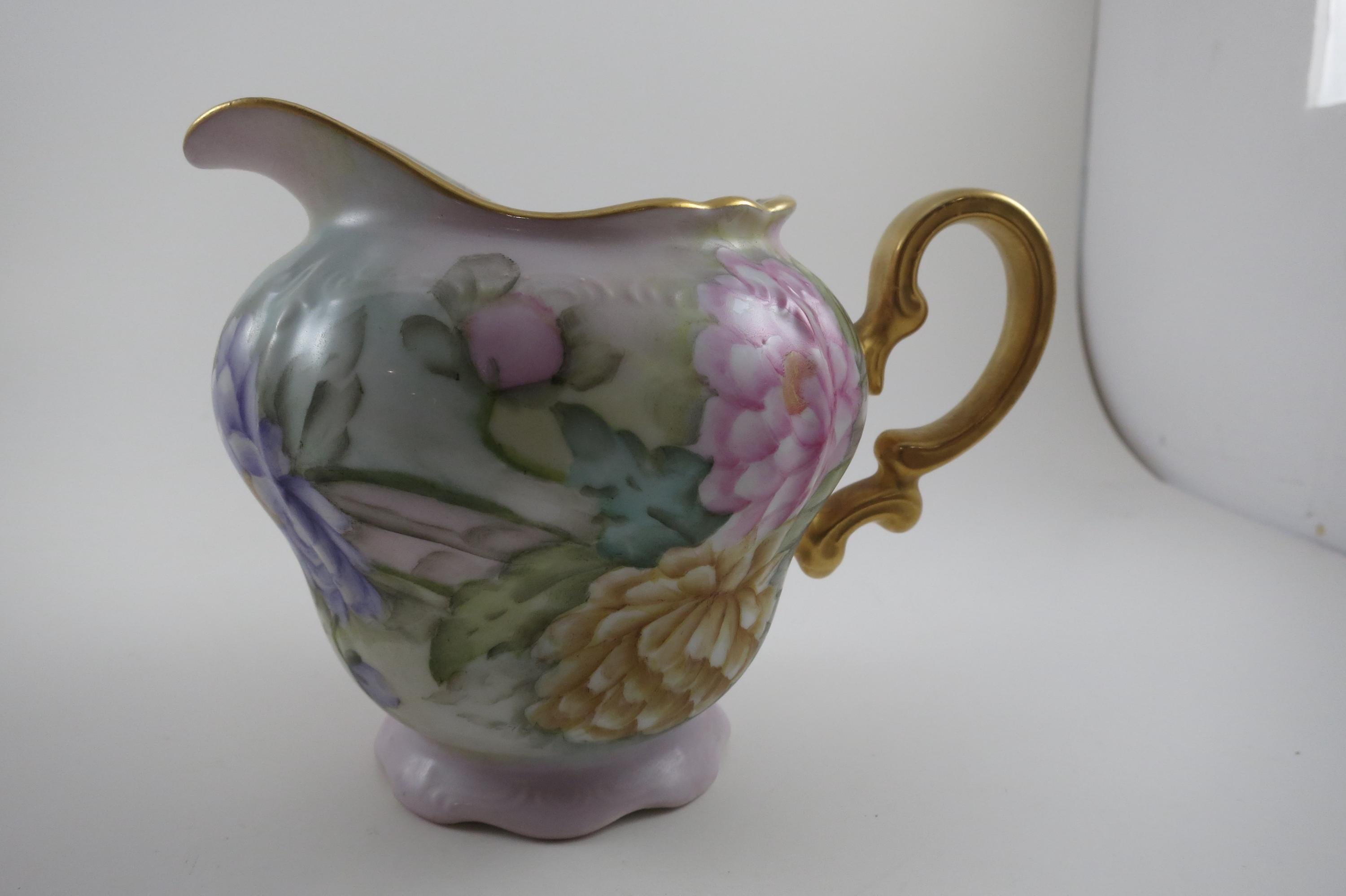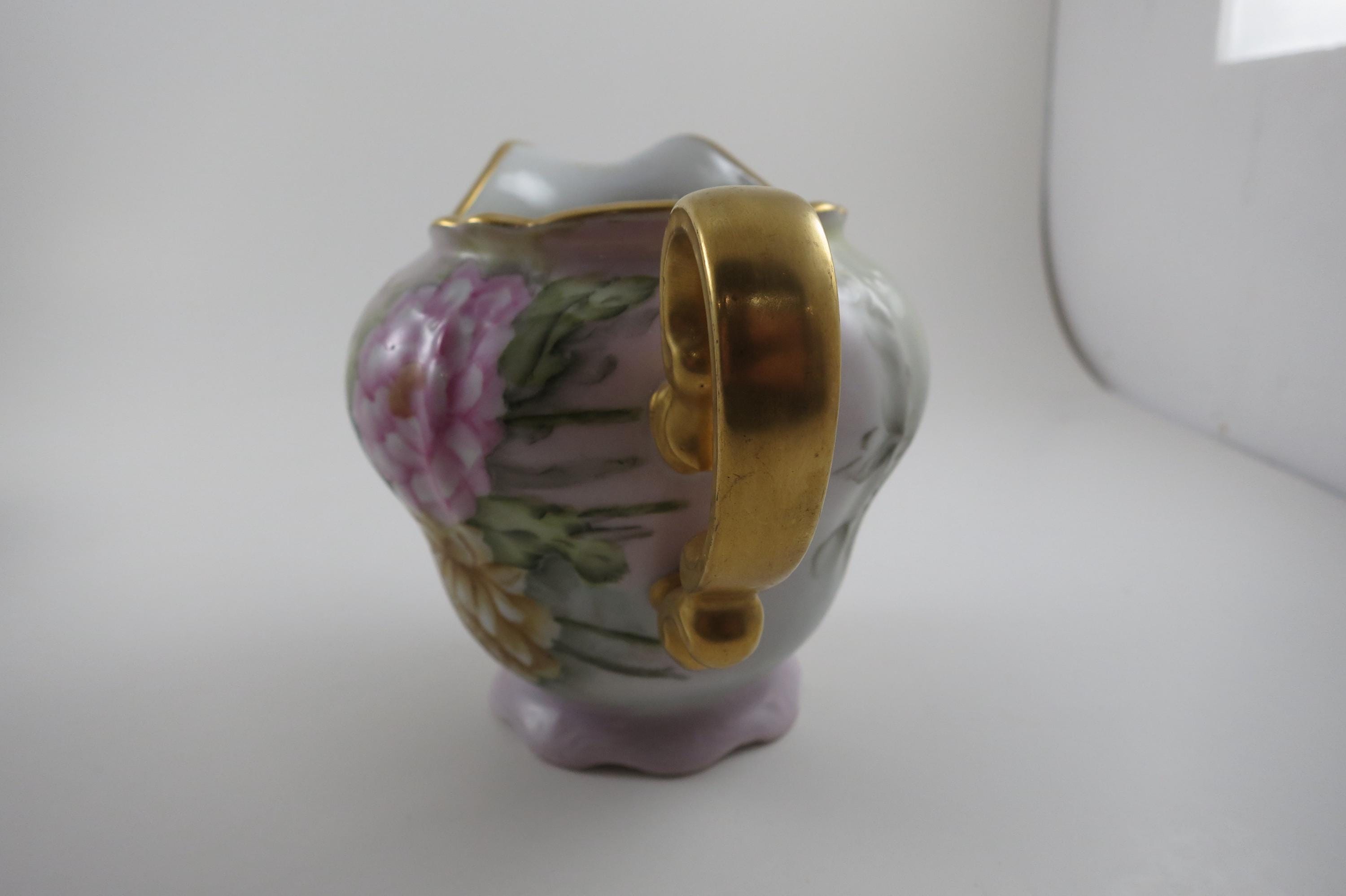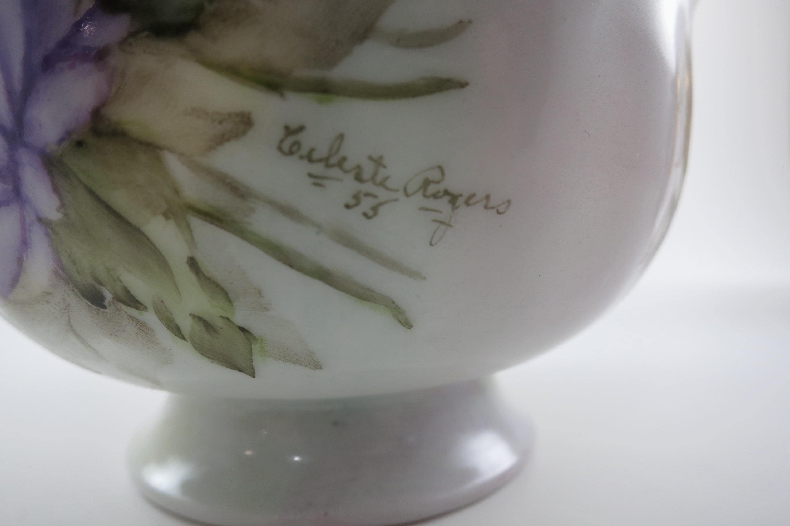 Hand Painted in pink, yellow and purple floral with heavy gold trim. Artist signed Celeste Rogers with 55, which I assume means 1955. We have several pieces from this company and artist and all wonderful display pieces! The creamer measures 5 inches wide and 3 3/4 inches tall, the sugar measures 4 inches wide and 2 1/2 inches tall.