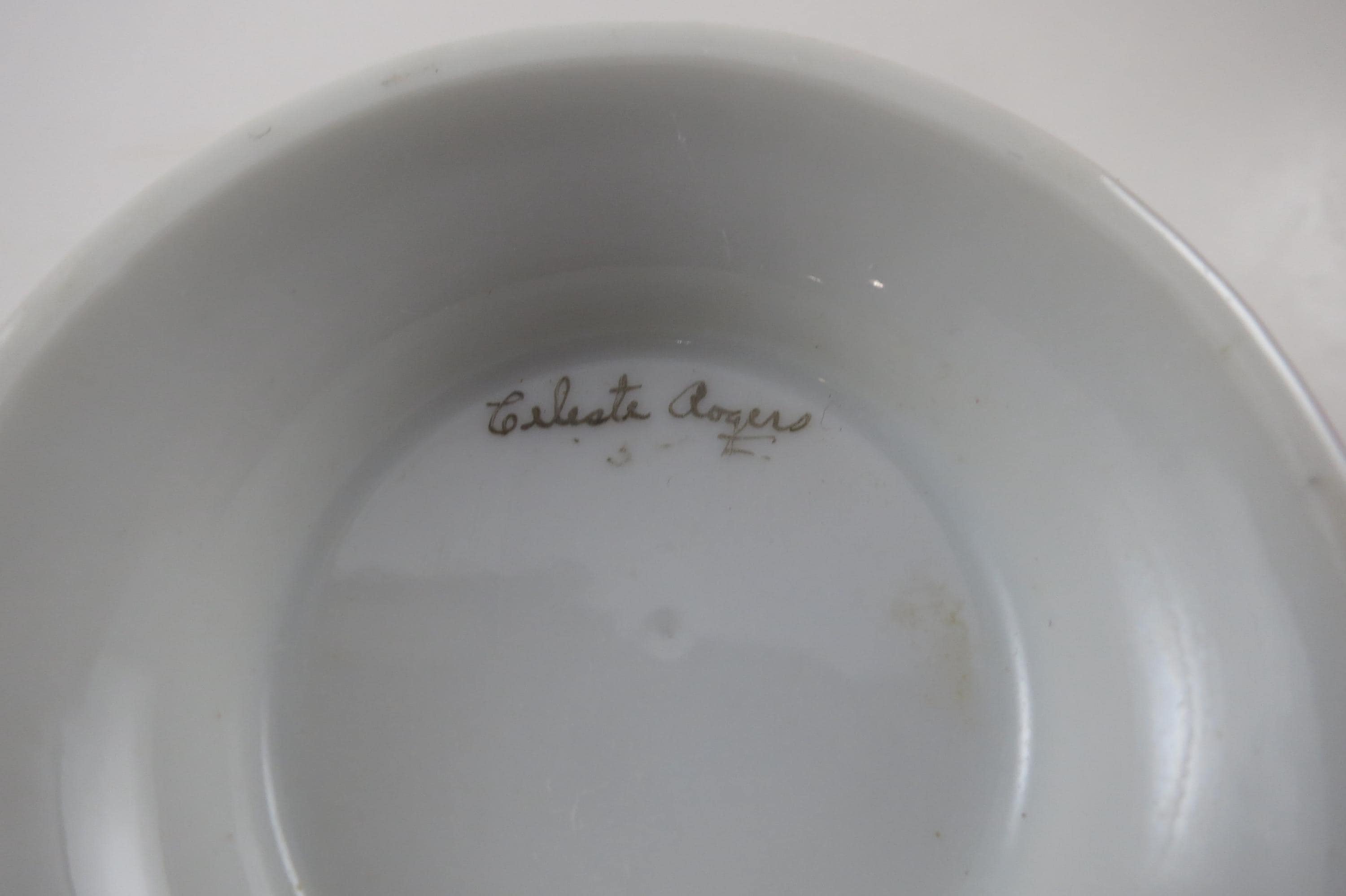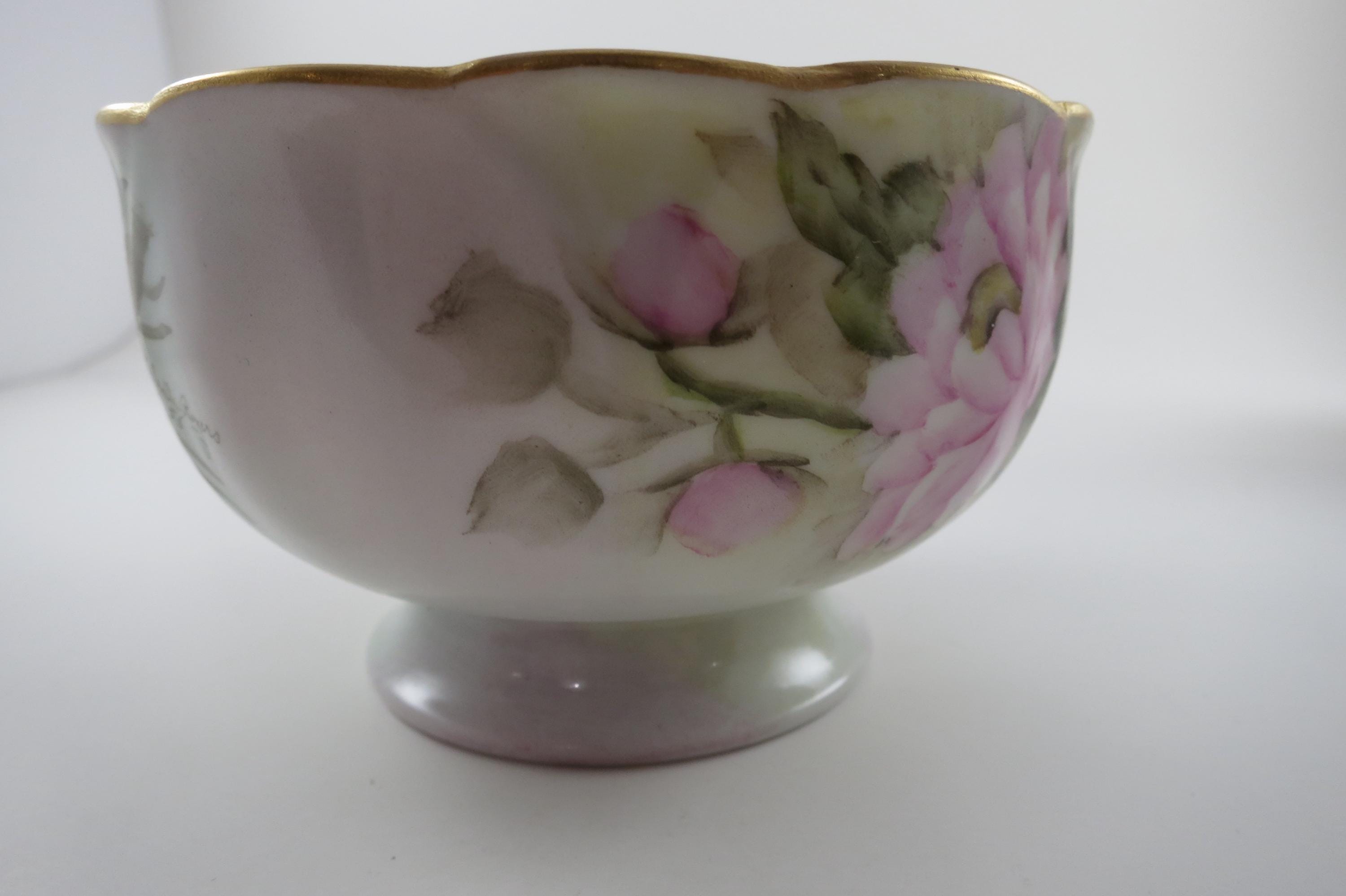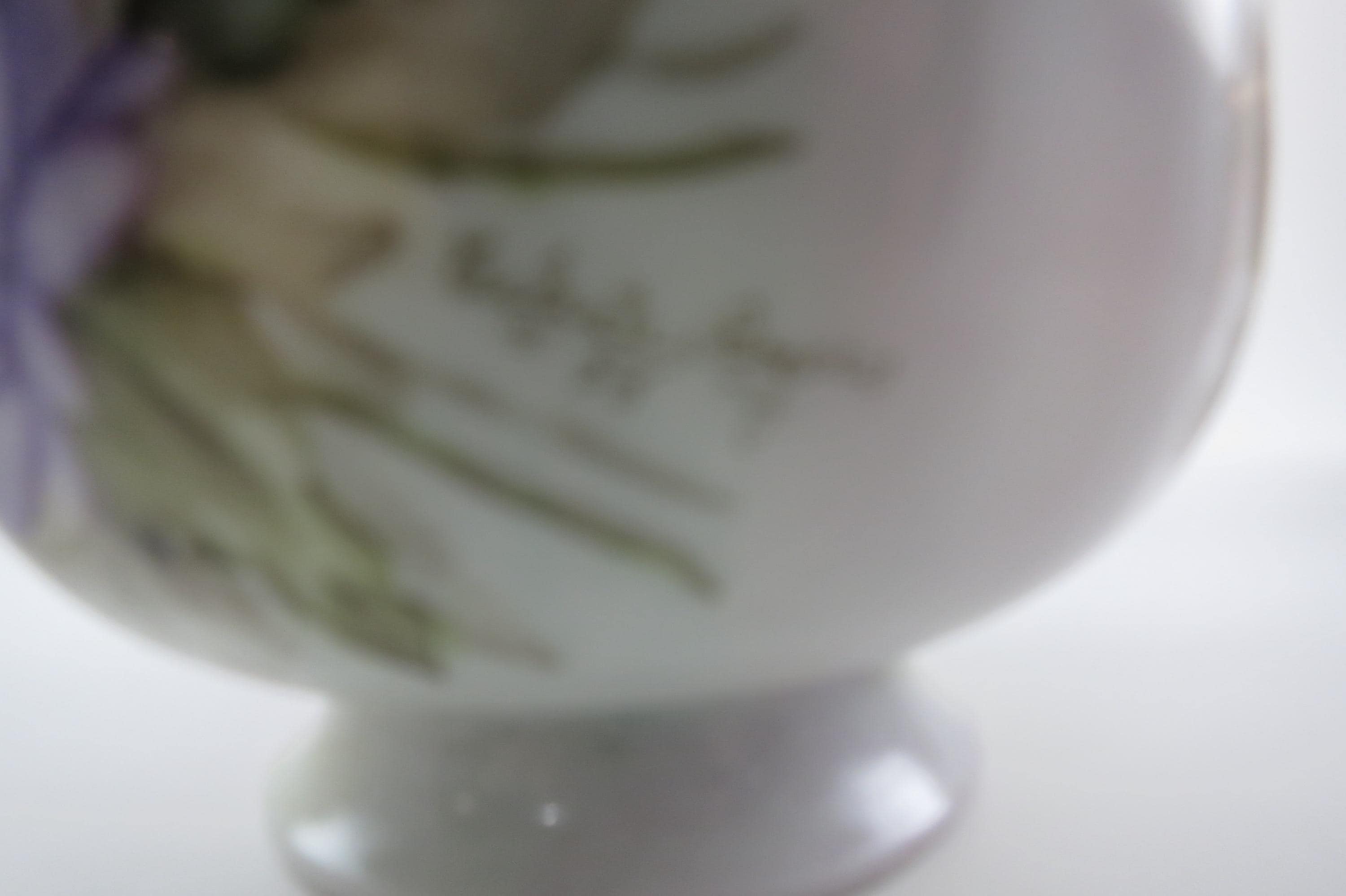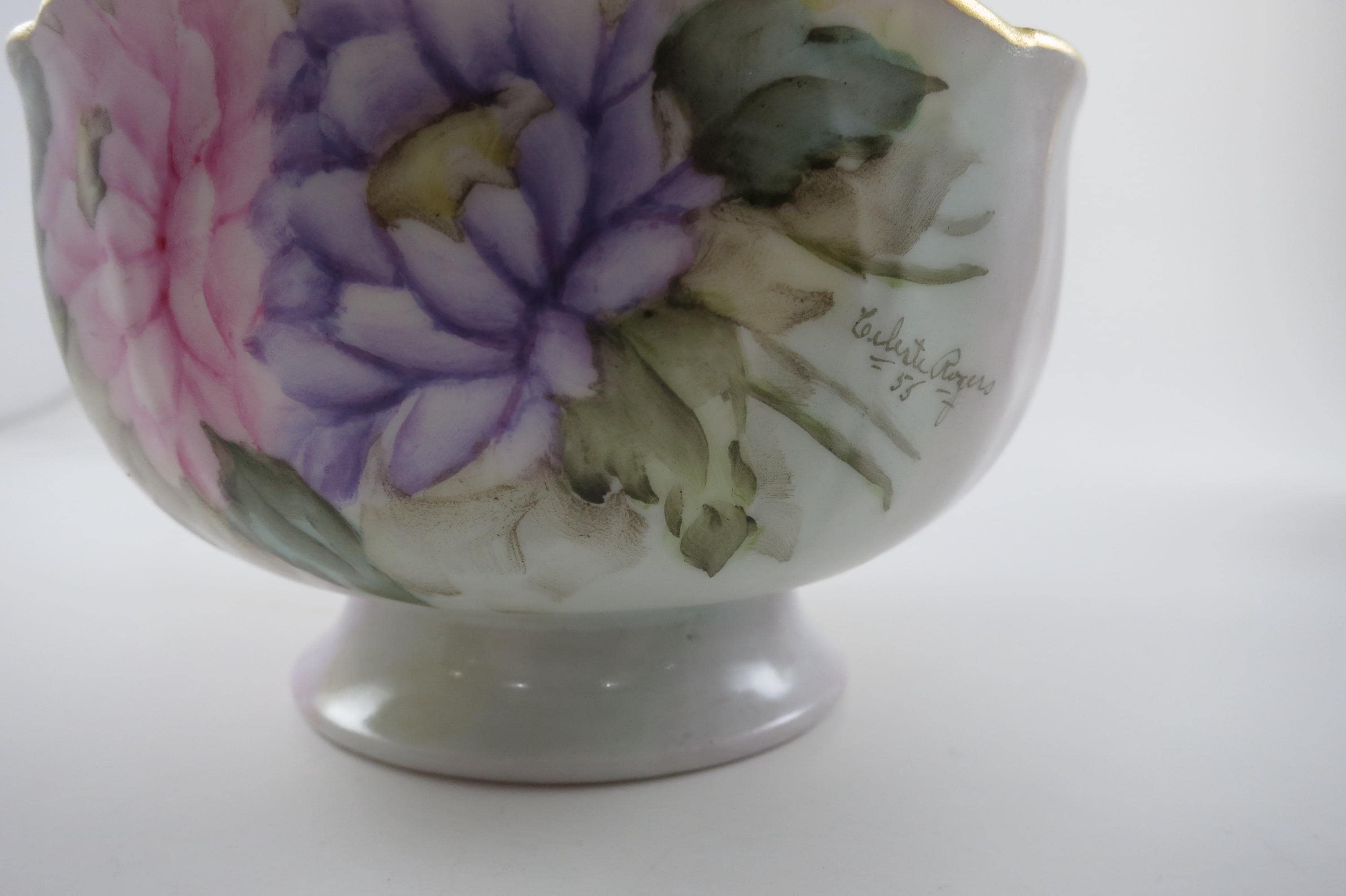 Hand Painted in pink, yellow and purple floral with heavy gold trim. Artist signed Celeste Rogers with 55, which I assume means 1955. We have several pieces from this company and artist and all wonderful display pieces! The creamer measures 5 inches wide and 3 3/4 inches tall, the sugar measures 4 inches wide and 2 1/2 inches tall.