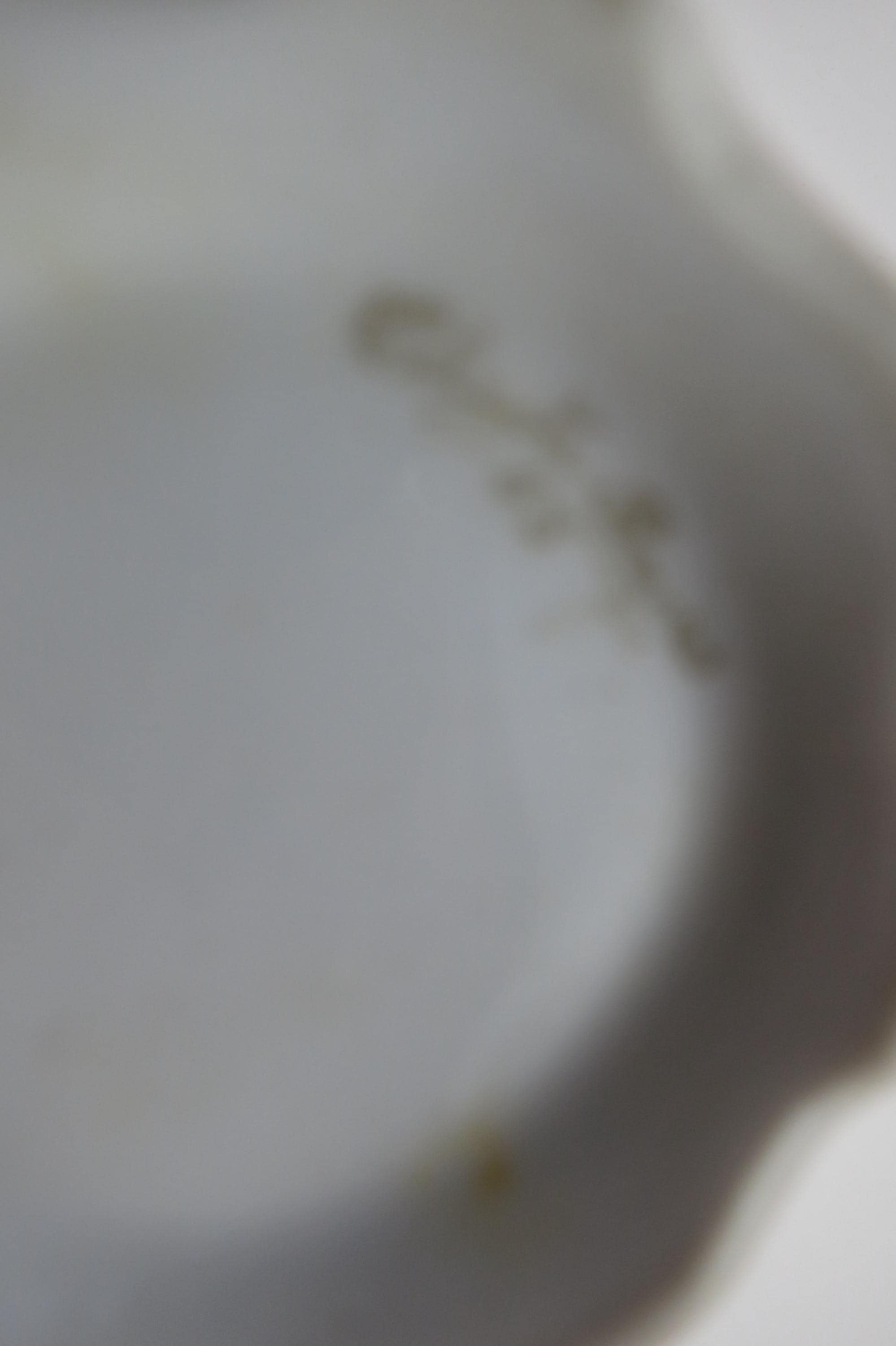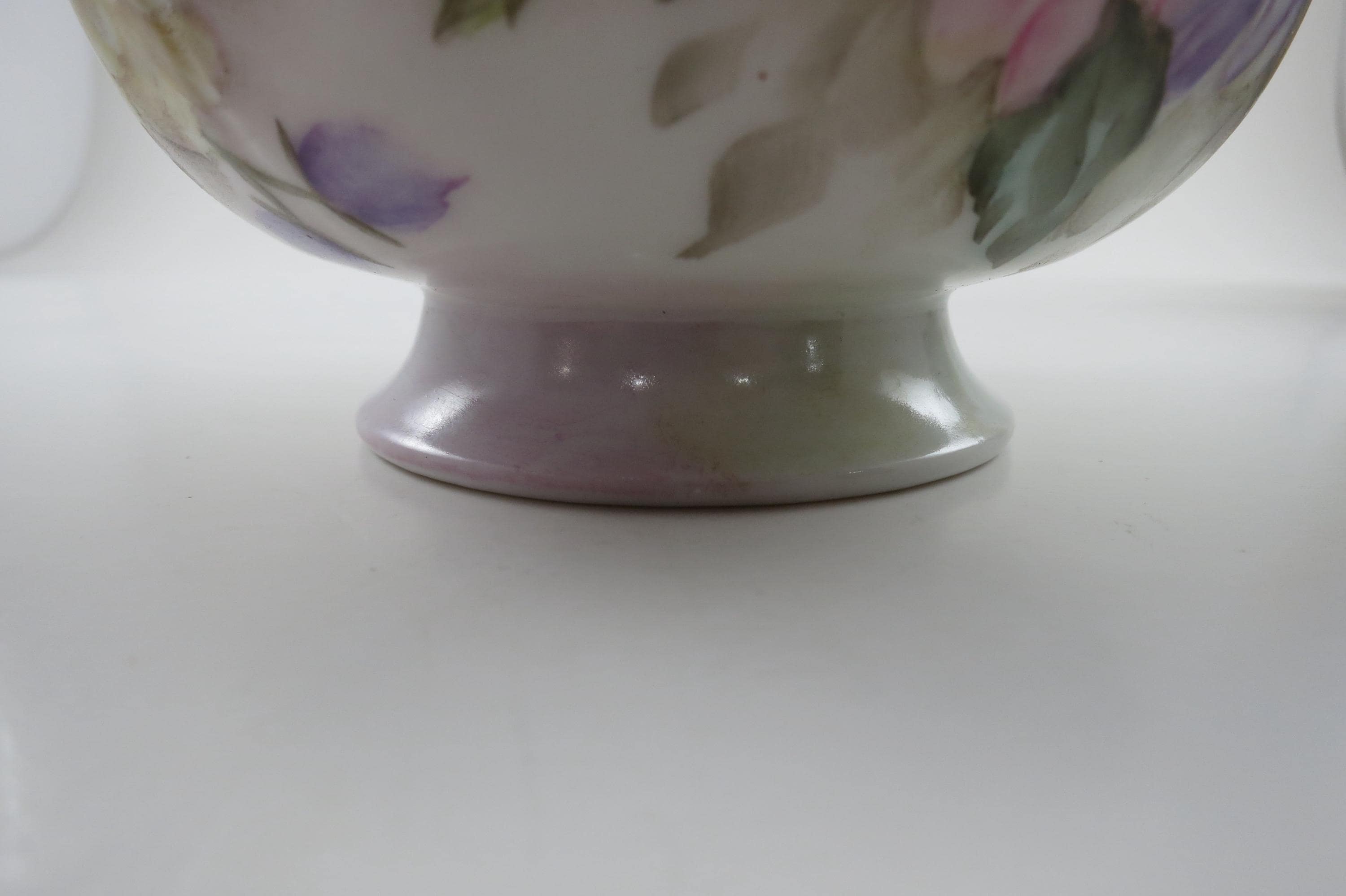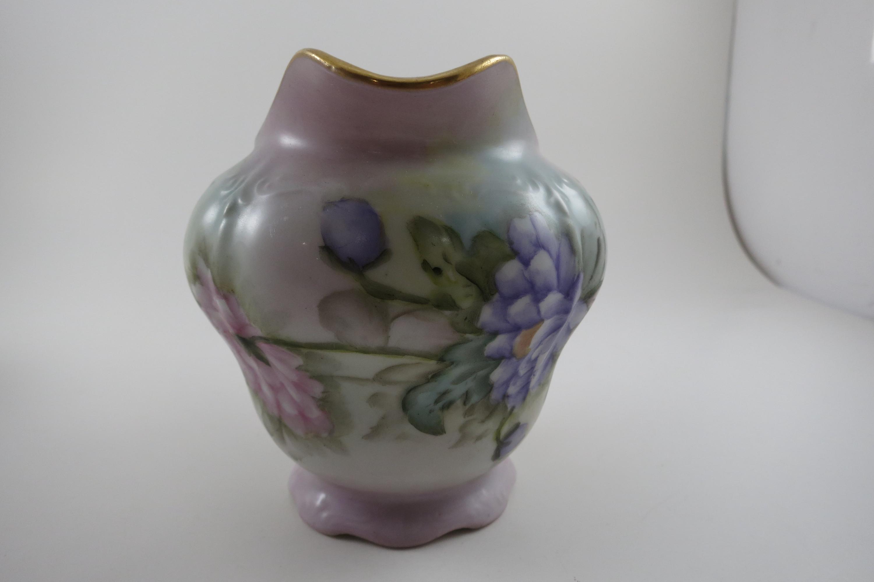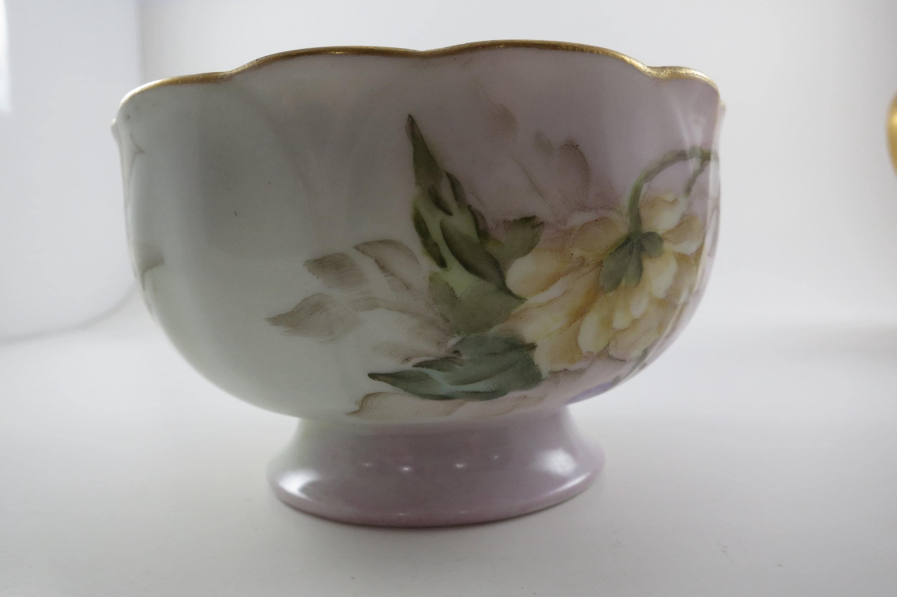 Hand Painted in pink, yellow and purple floral with heavy gold trim. Artist signed Celeste Rogers with 55, which I assume means 1955. We have several pieces from this company and artist and all wonderful display pieces! The creamer measures 5 inches wide and 3 3/4 inches tall, the sugar measures 4 inches wide and 2 1/2 inches tall.