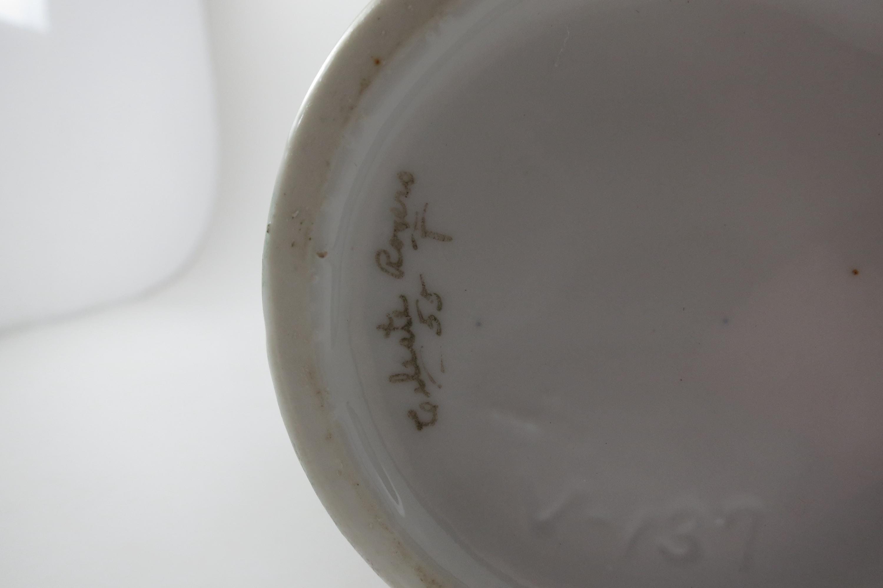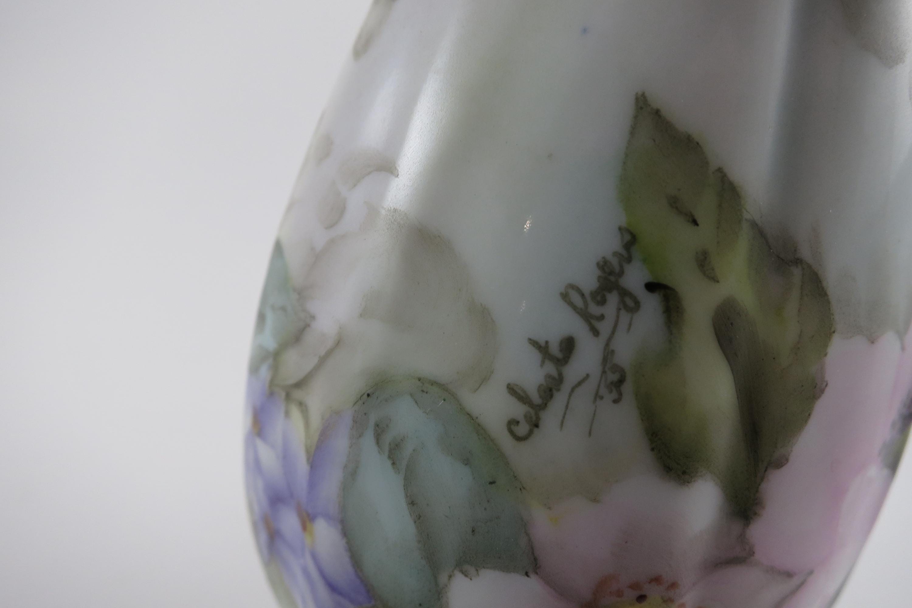 Hand Painted in pink, yellow and purple floral with heavy gold trim. Artist signed Celeste Rogers with 56, which I assume means 1956. We have several pieces from this company and artist and all wonderful display pieces! This vase measures 8 1/2 inches tall and 3 3/4 inches wide. It is a beauty.