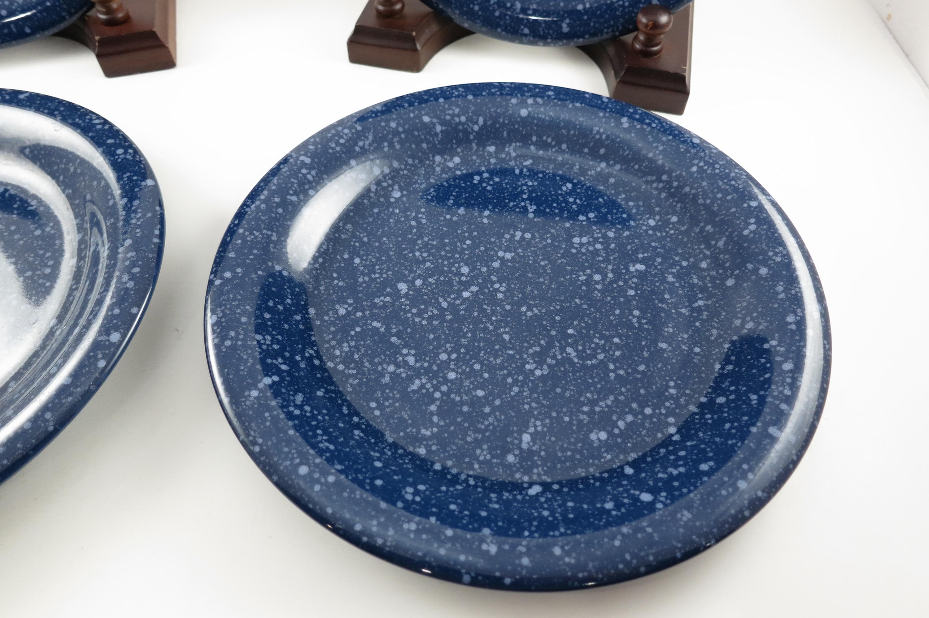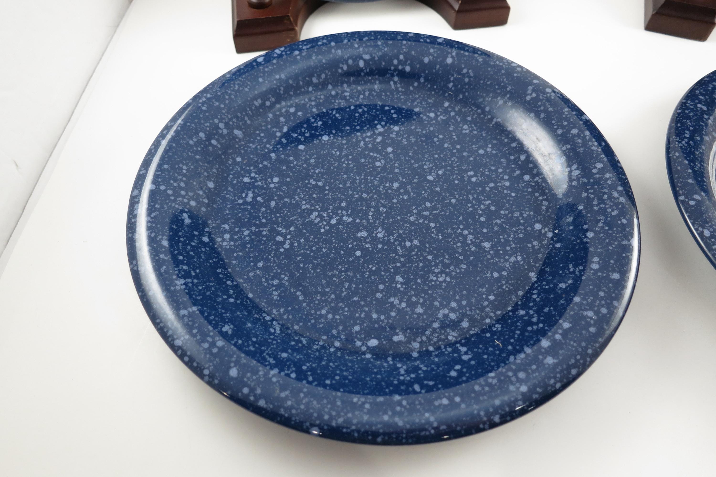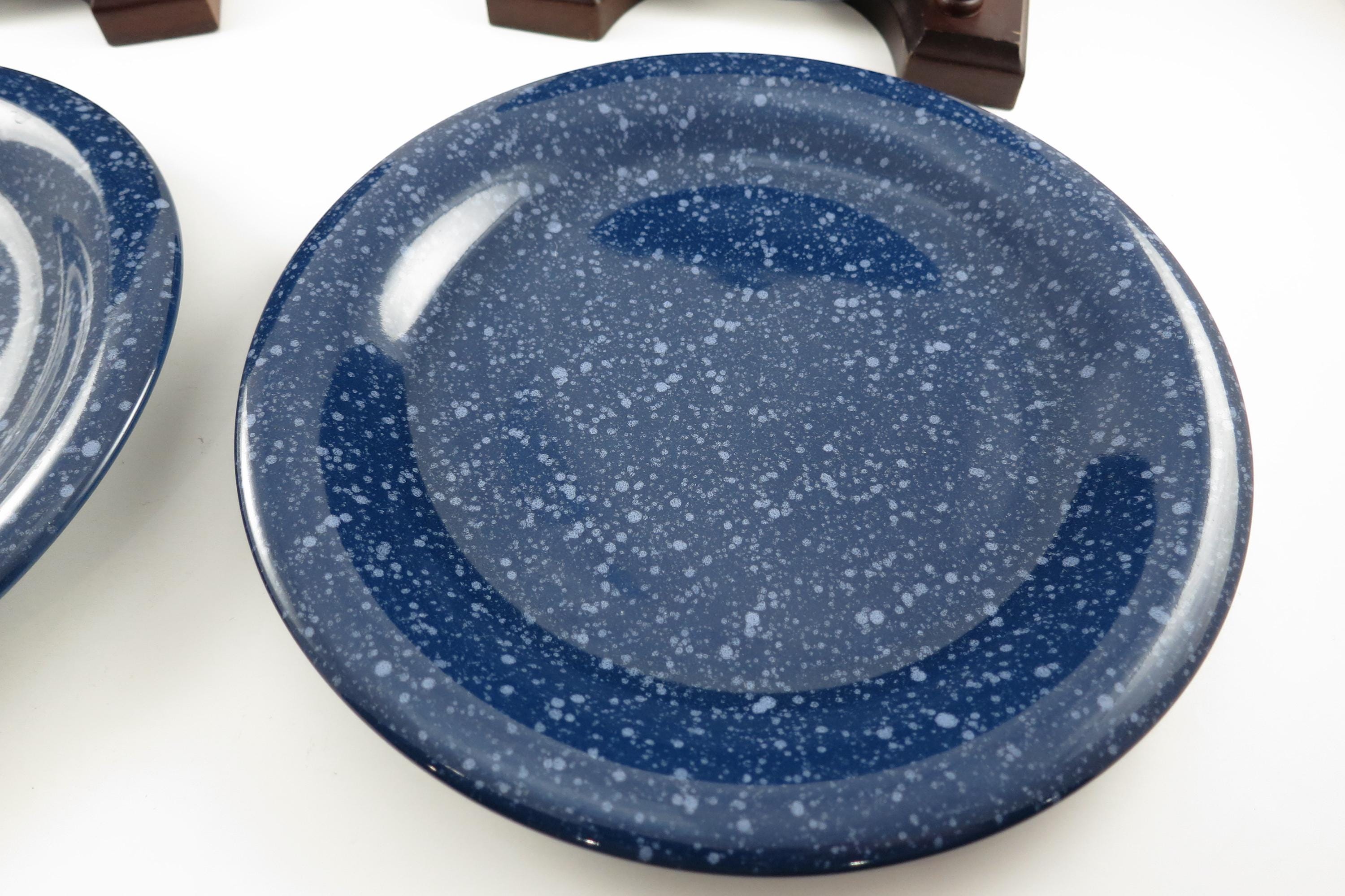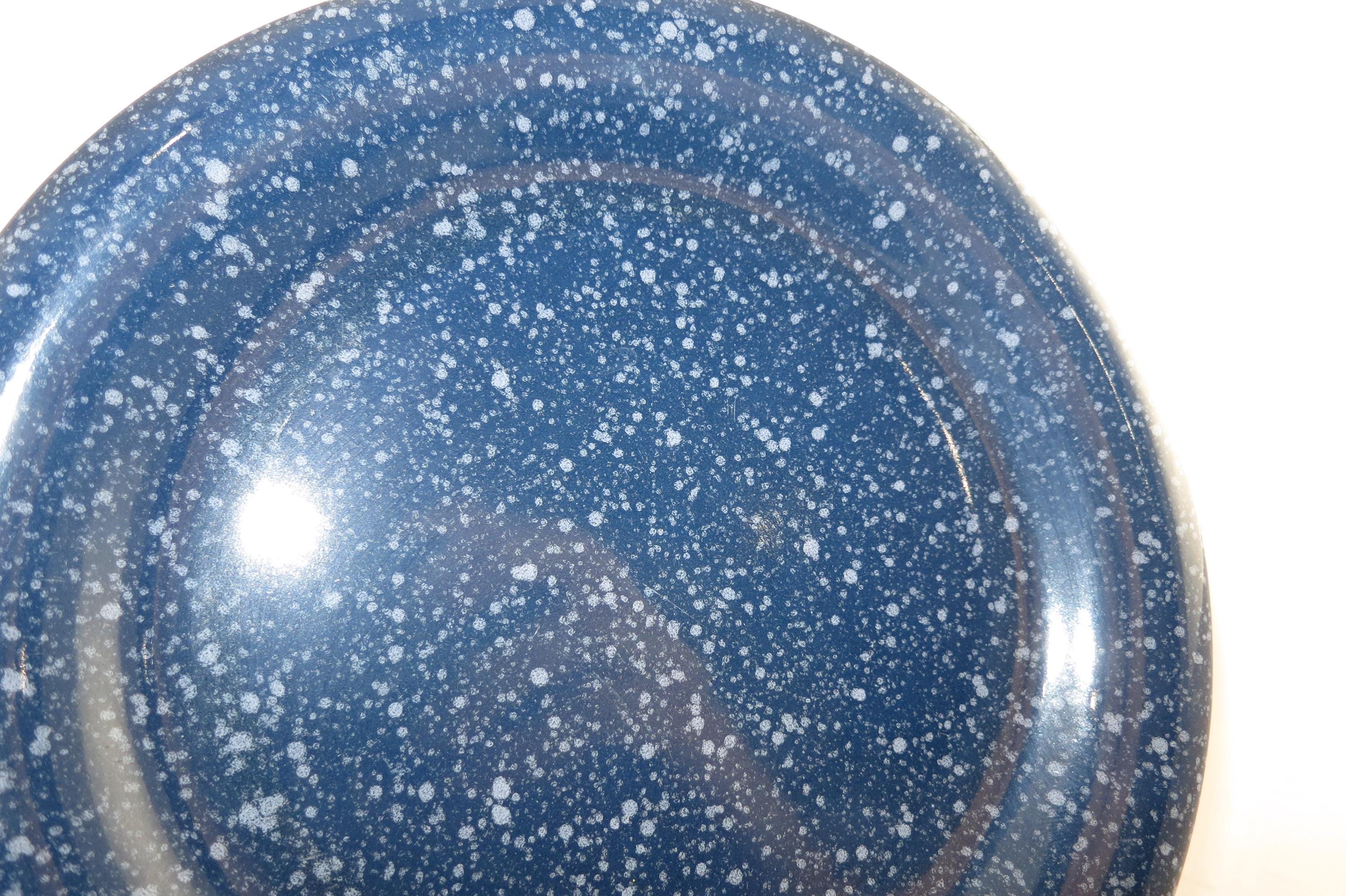 Beautiful dinnerware, Unbranded, deep blue with white speckle. Each measures 7 5/8 inches diameter. They are in excellent used condition.