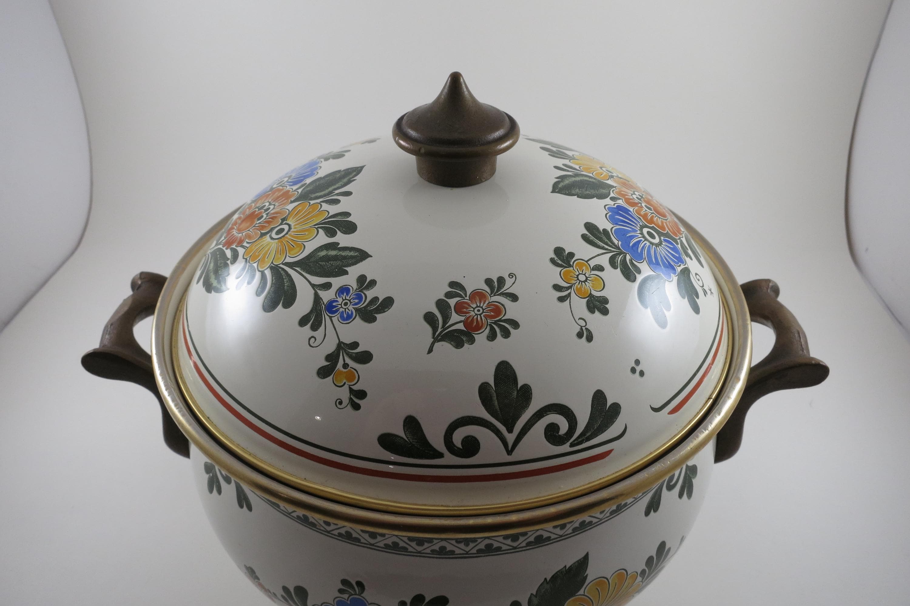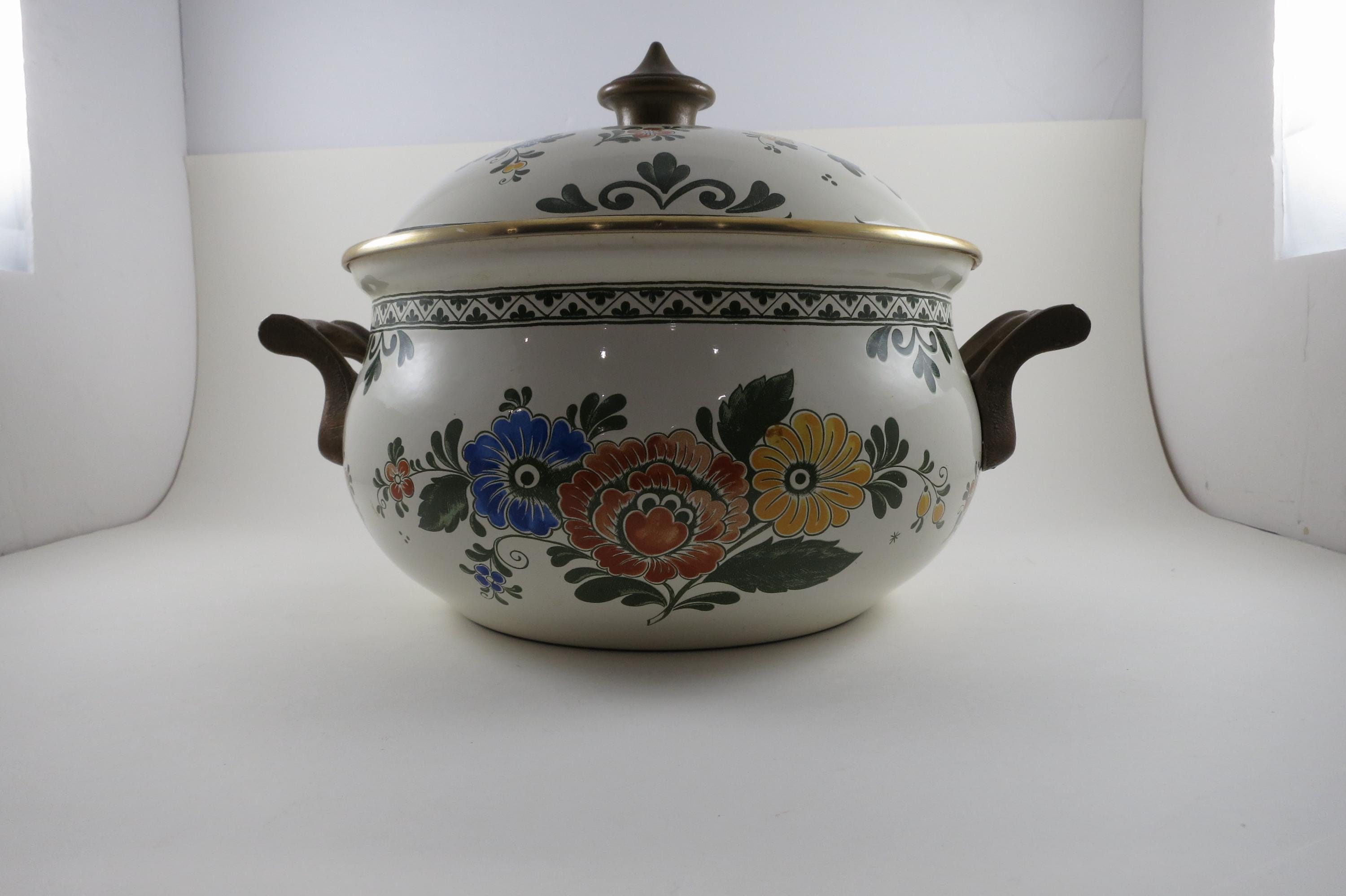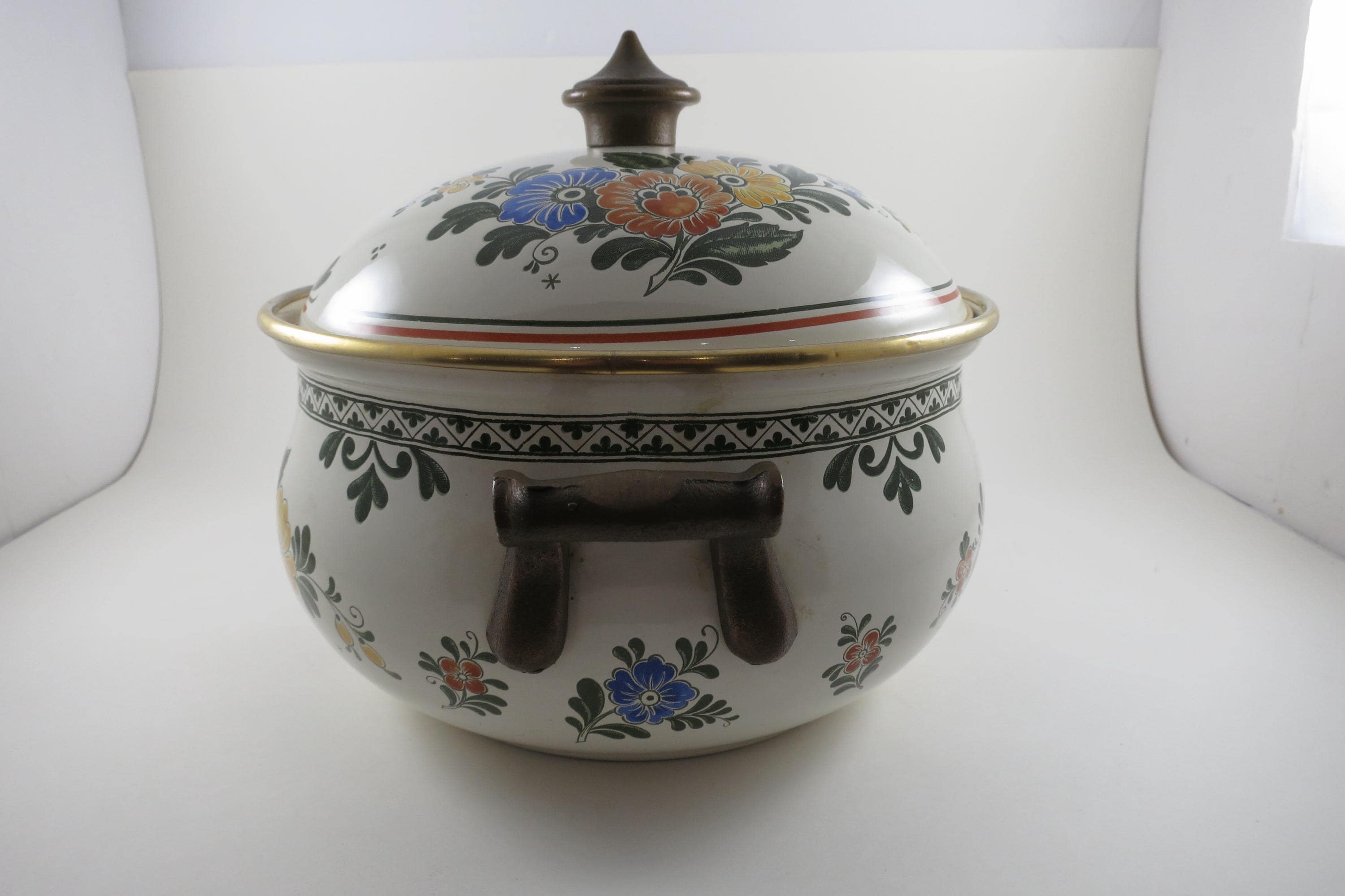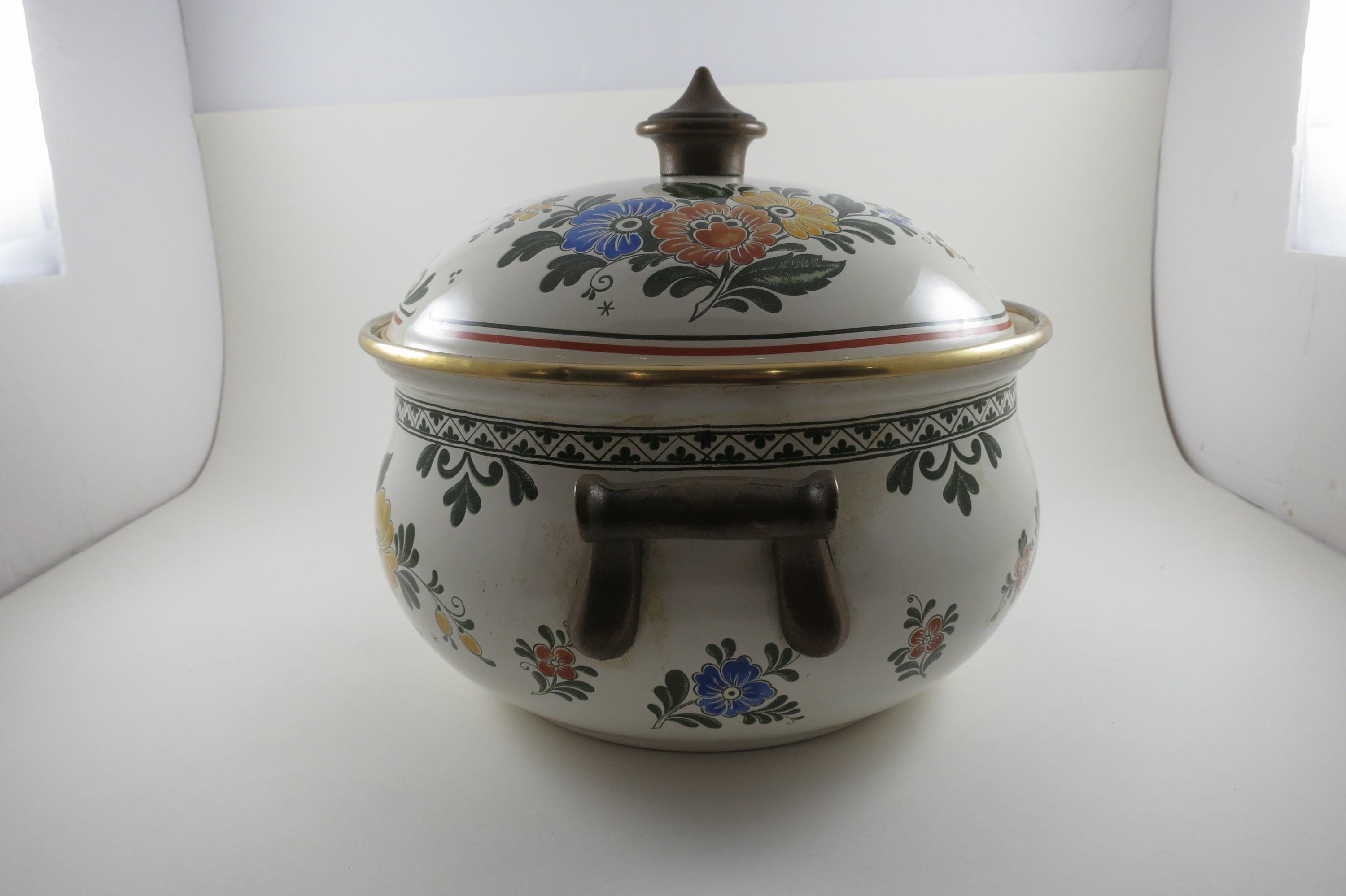 Vintage ASTA Enamelware Dutch Oven Pan/Lid Casserole Floral 1960s Brass Handles Vintage