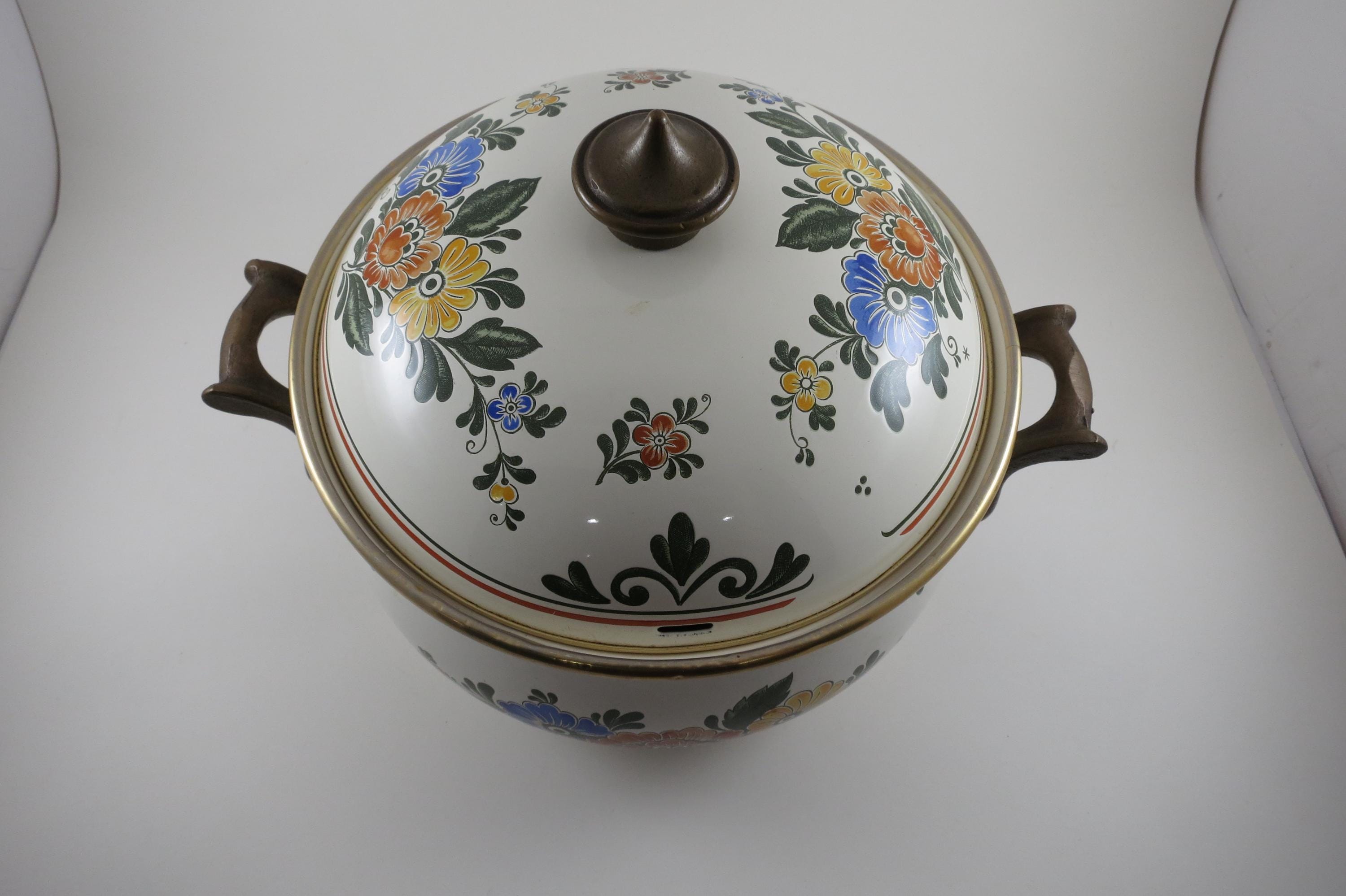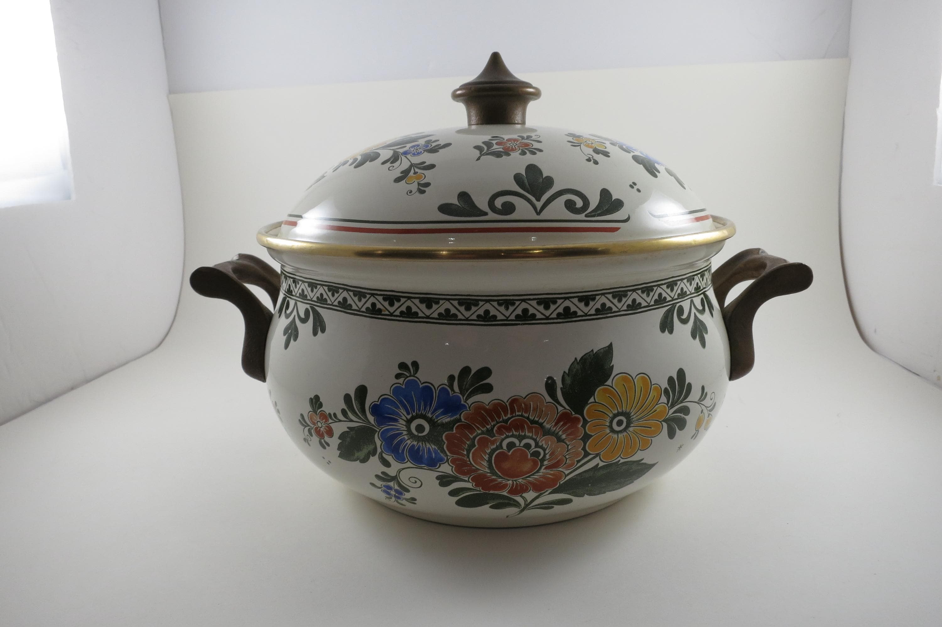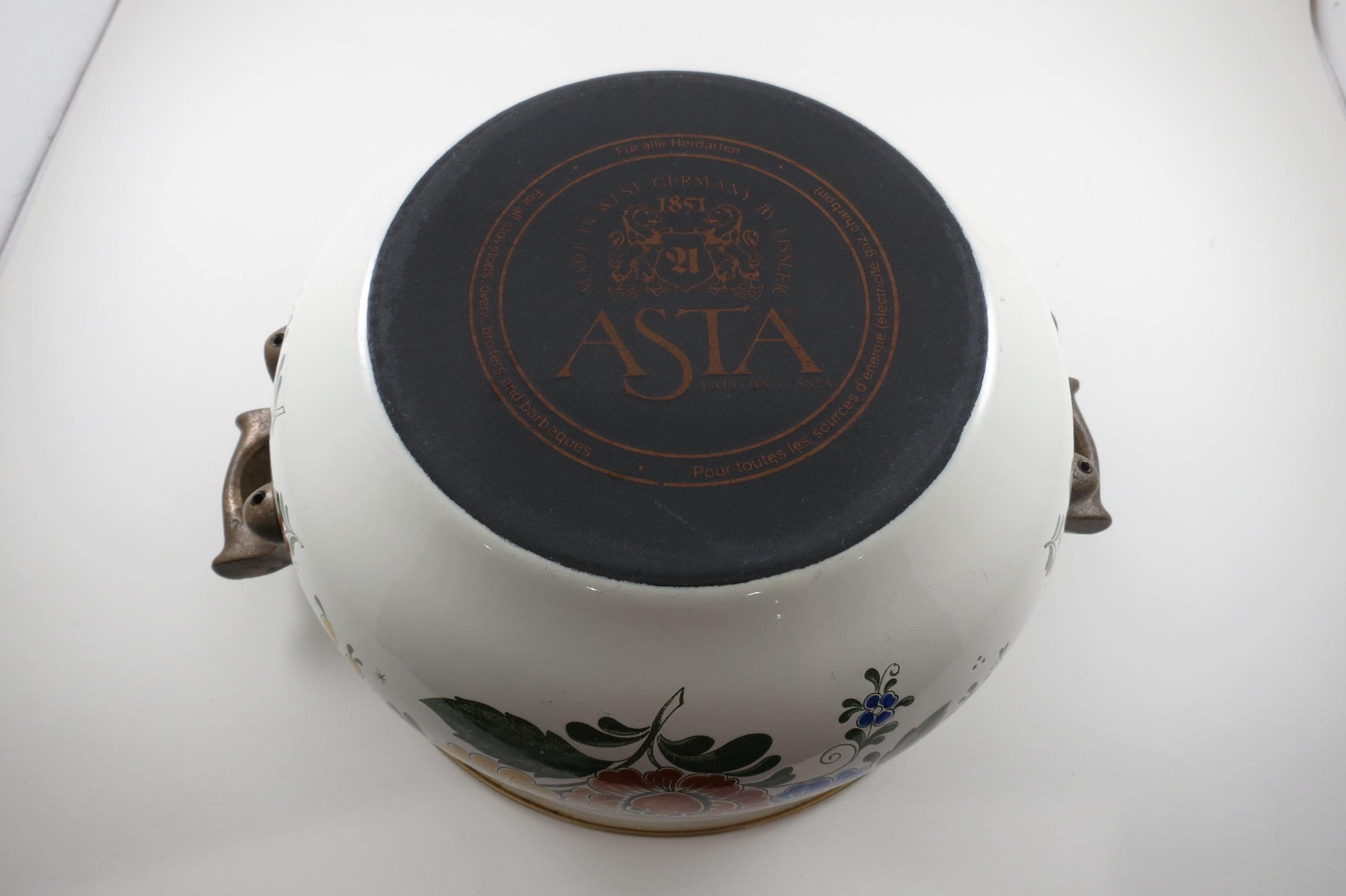 Vintage ASTA Enamelware Dutch Oven Pan/Lid Casserole Floral 1960s Brass Handles Vintage