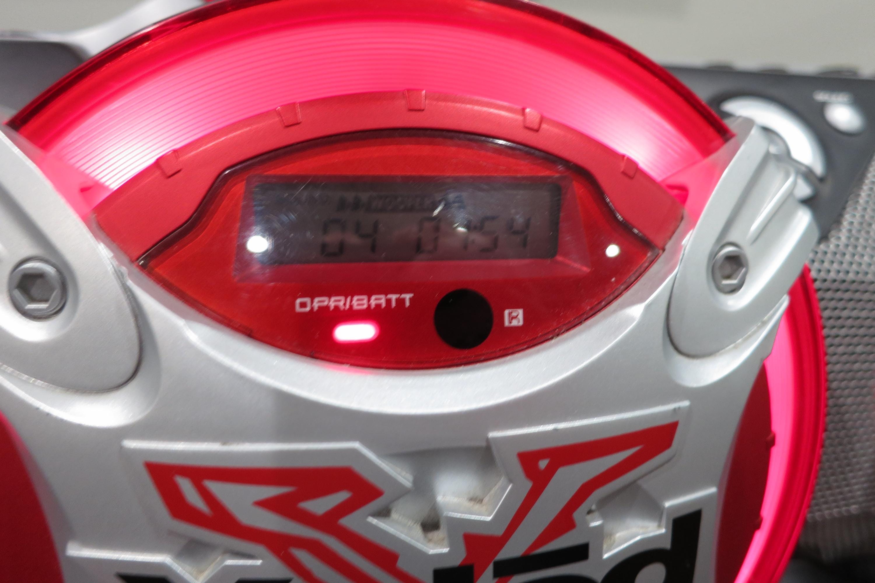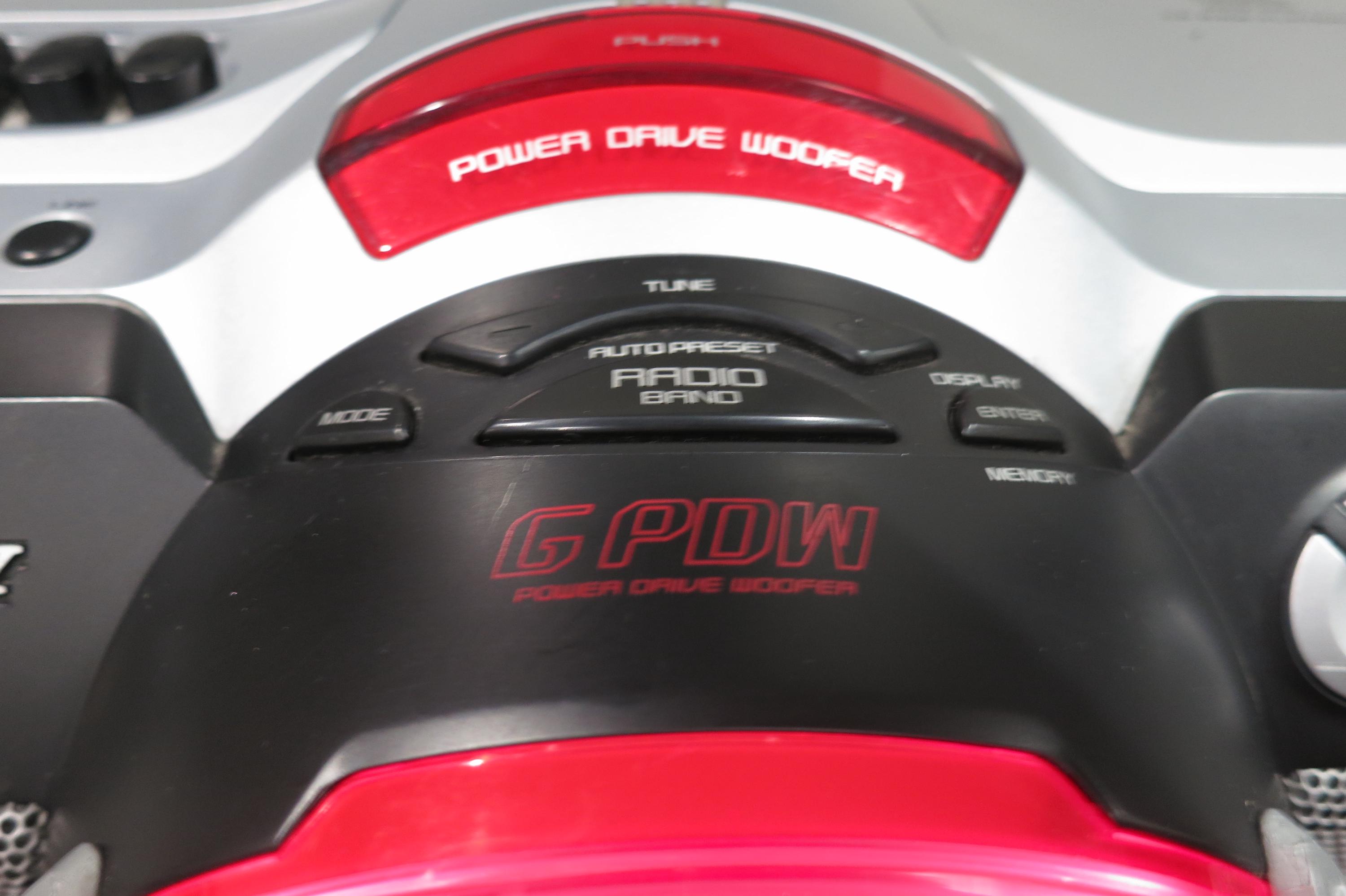This one is black, red and silver in color. Features a Power Drive Woofer (PDW), lights up red when turned on, heavy duty carrying handle, digital display, Auto Equalizer with settings for Rock, Dance, Salsa, Flat and Reggaeton, Headphone Input, Cd player, cassette deck and more.