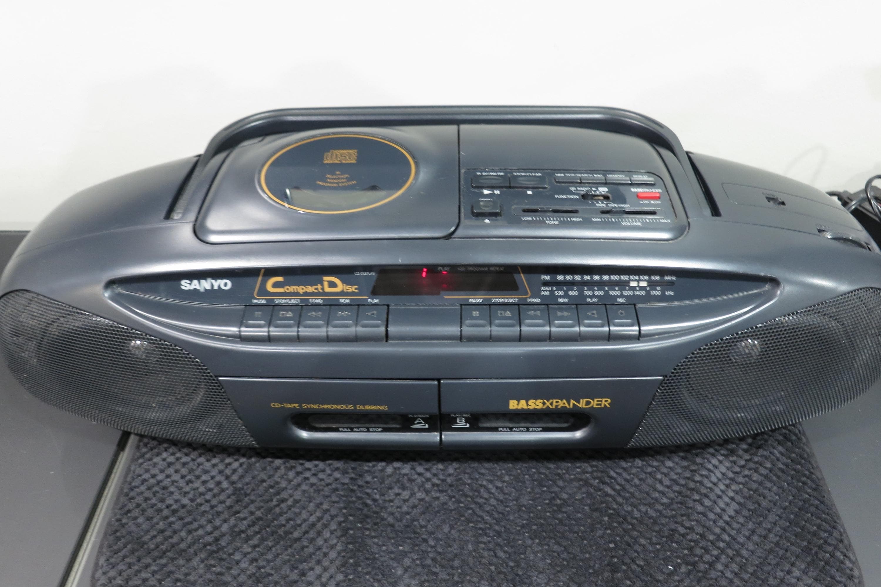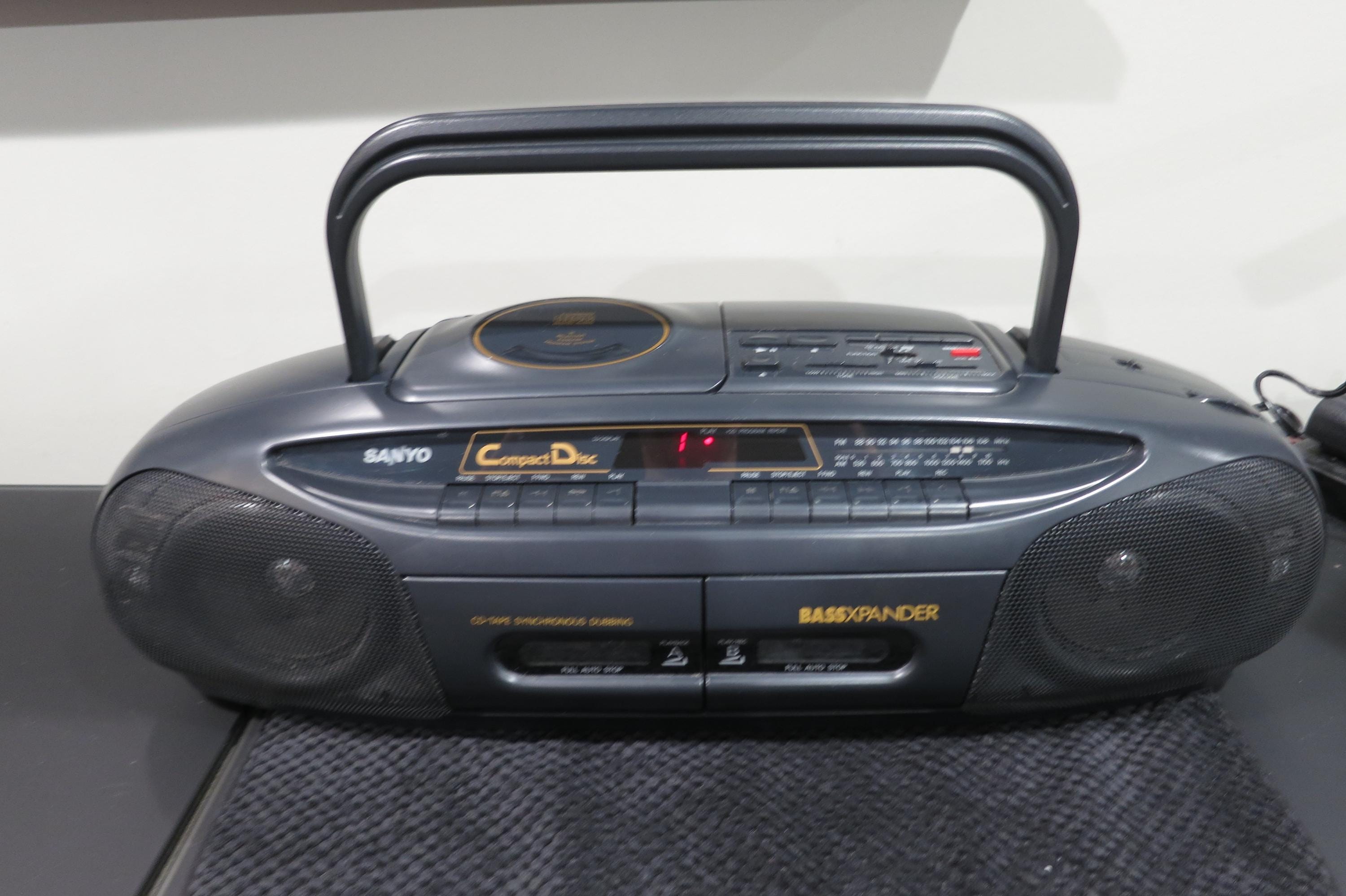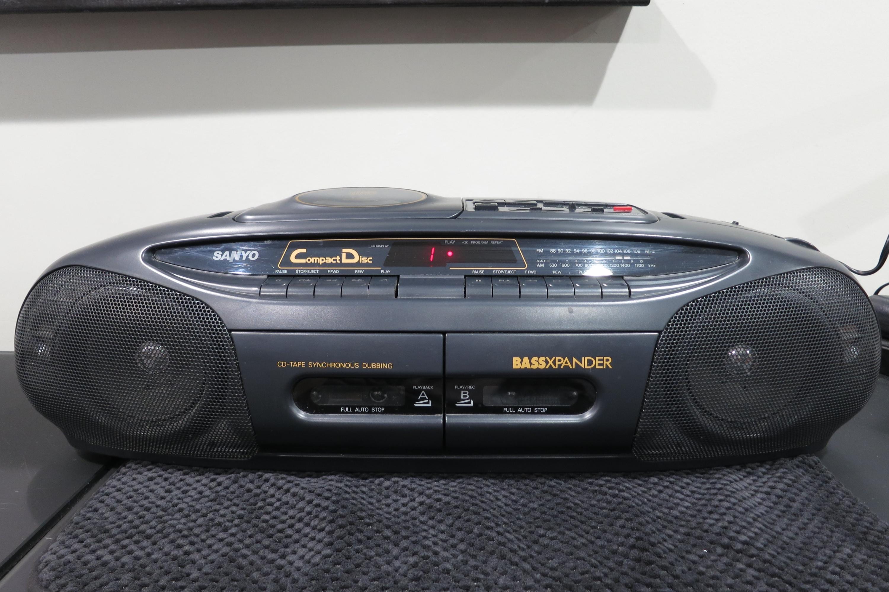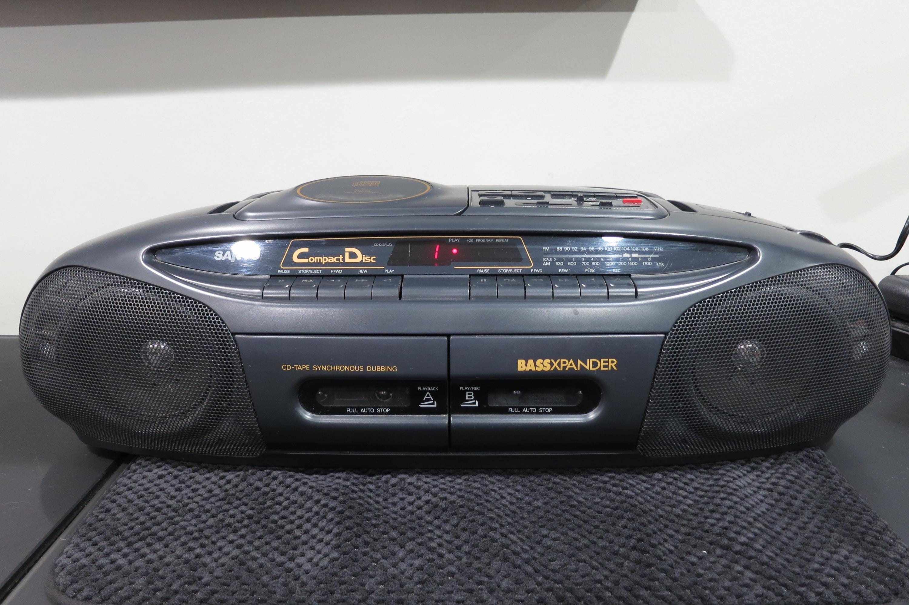 Vintage Sanyo MCD-Z2 CD Radio Cassette Recorder Portable Boom Box Works Perfect. Very nice vintage stereo!! Features CD with digital display, tone control, cassette player with full auto stop, cd-tape synchronous dubbing, good antenna and carrying handle. Runs off of batteries or the included power cord. All the functions work perfect!! Unpack, plug in and play!! Measures 24 inches wide, 9 inches deep and 7 1/4 inches tall.