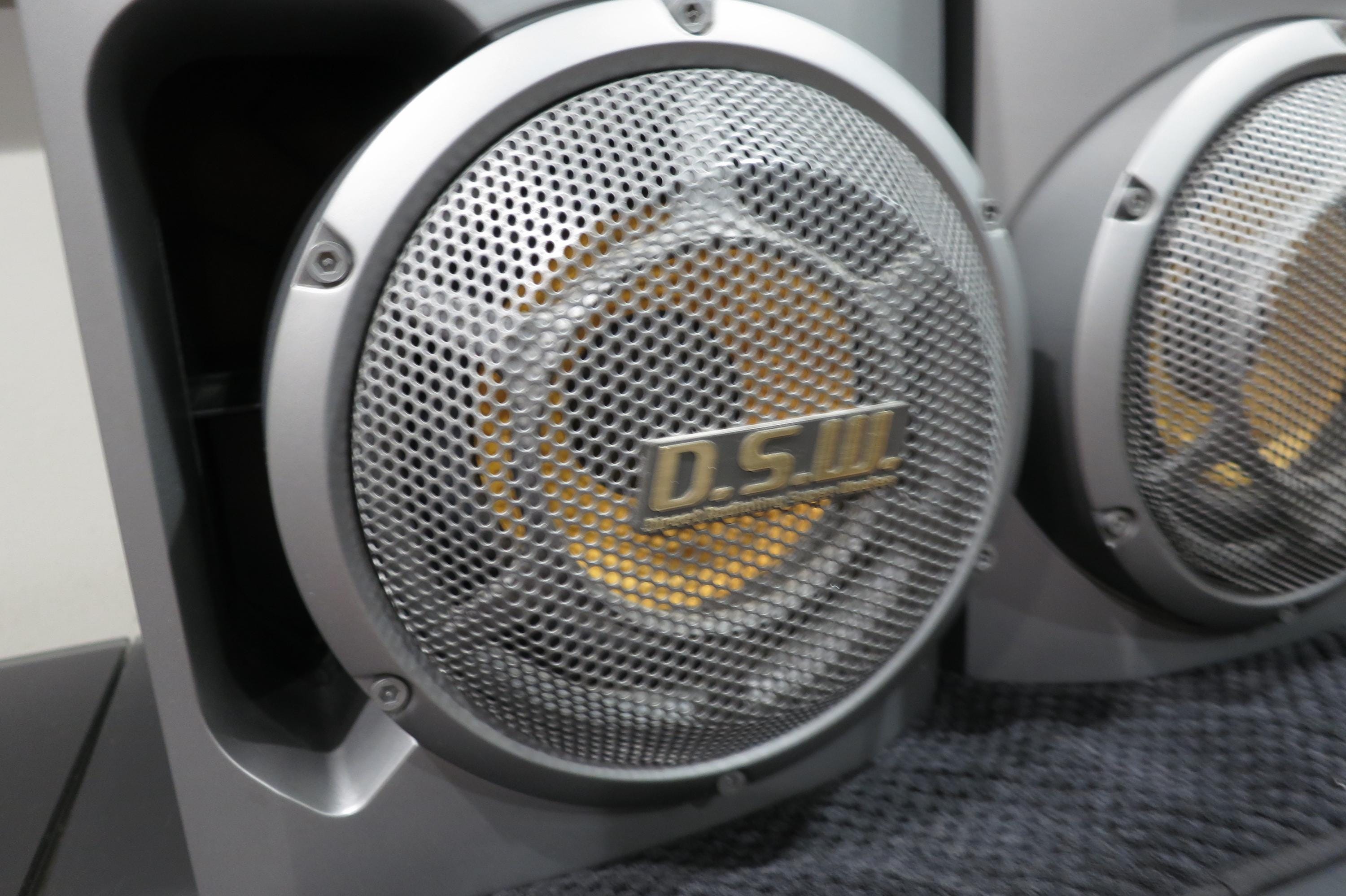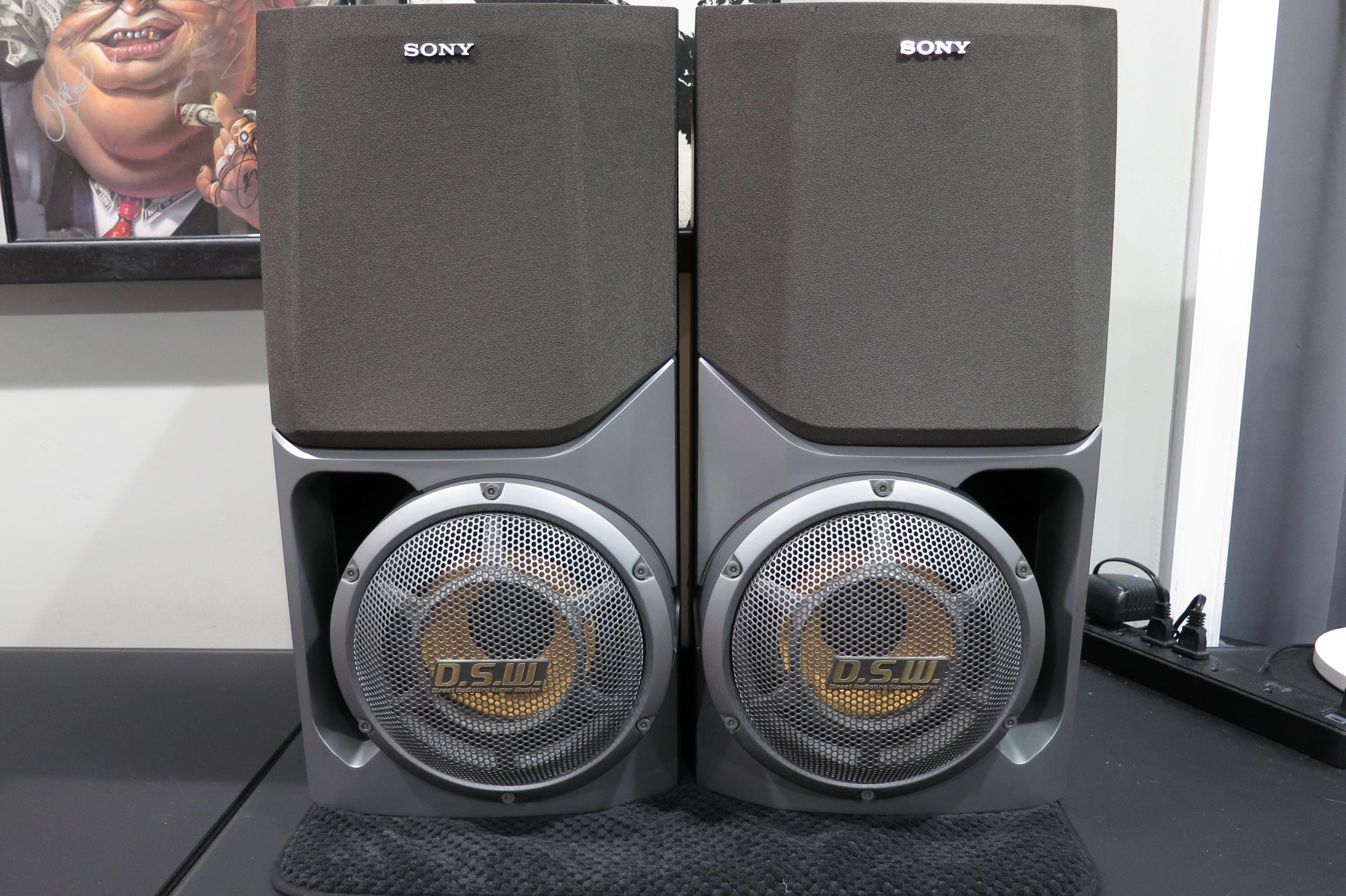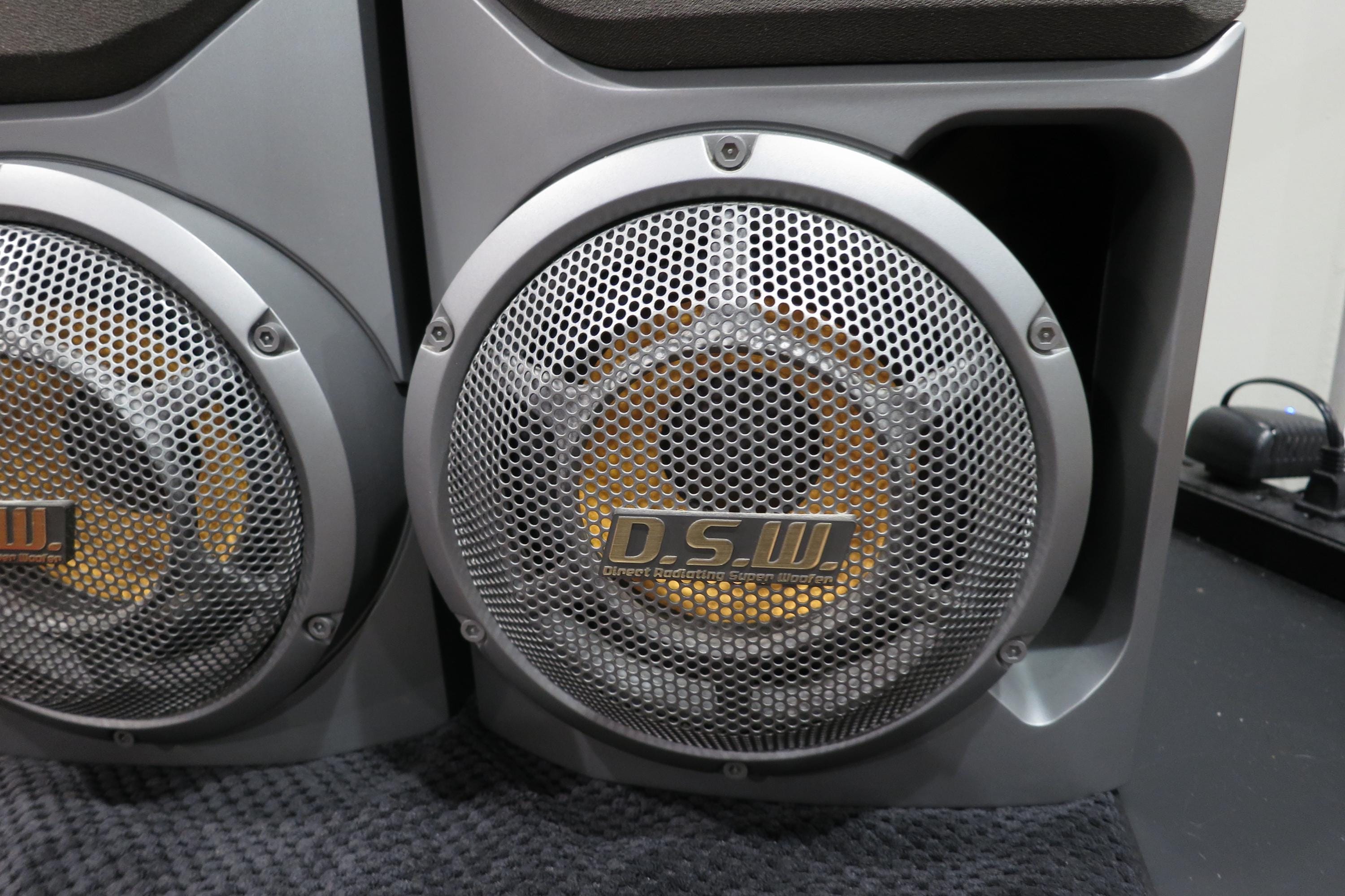 These guys are big on looks, and even bigger on sound! They are gray and silver and feature DSW Direct Radiating Super Woofers. Each measures 20 inches tall, 9 3/4 inches wide and 9 1/4 inches deep. (Sorry, they won't fit on the bookshelves!). Great sound, crystal clarity. Excellent condition, cases have a few small corner dings.
