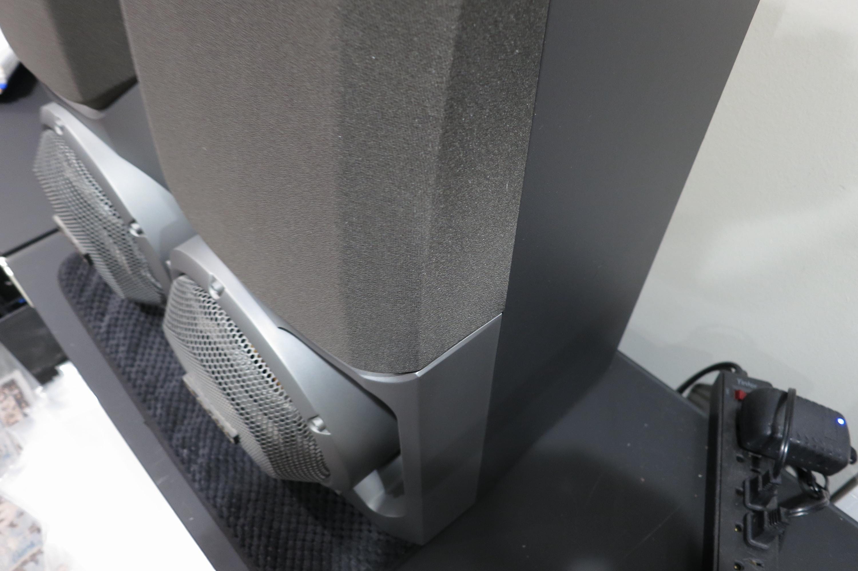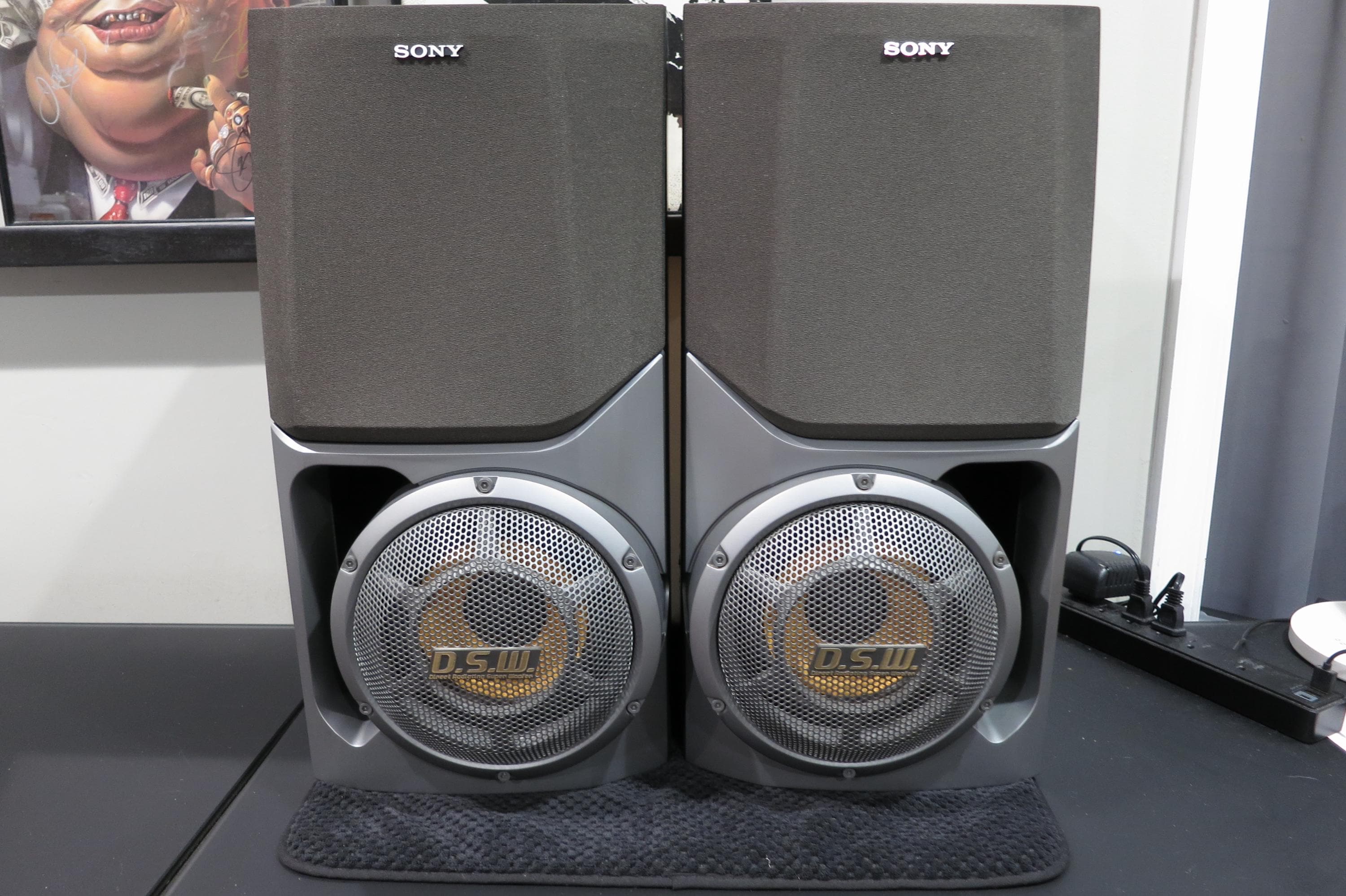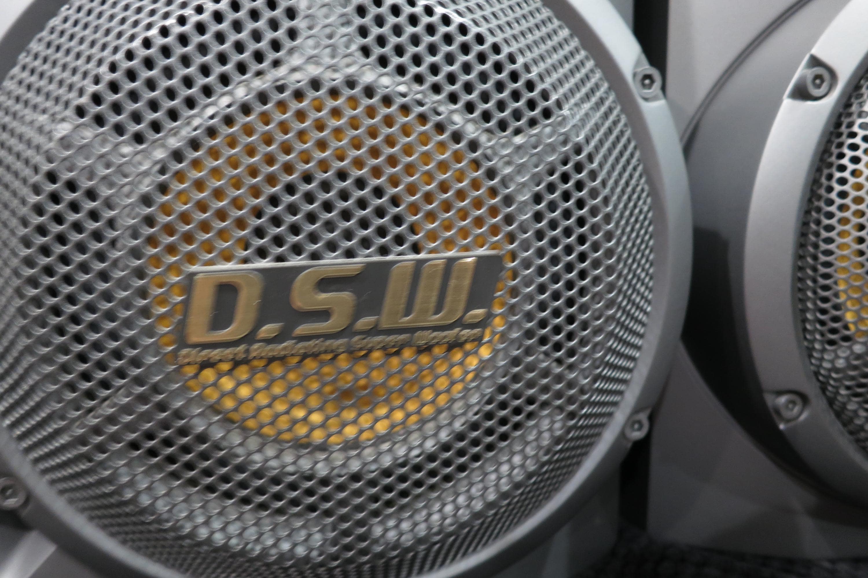 These guys are big on looks, and even bigger on sound! They are gray and silver and feature DSW Direct Radiating Super Woofers. Each measures 20 inches tall, 9 3/4 inches wide and 9 1/4 inches deep. (Sorry, they won't fit on the bookshelves!). Great sound, crystal clarity. Excellent condition, cases have a few small corner dings.