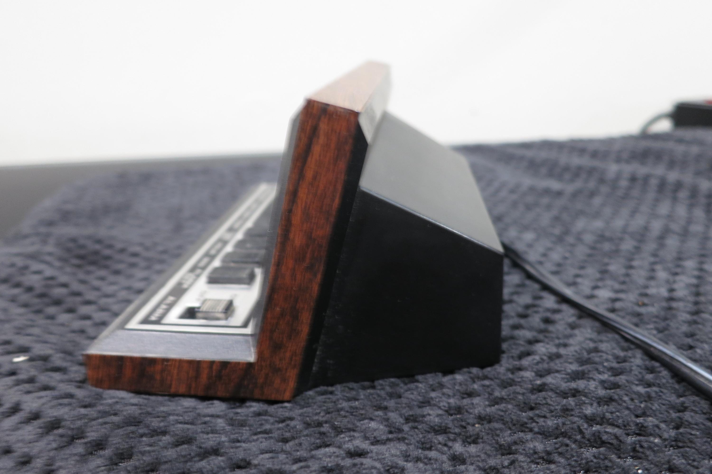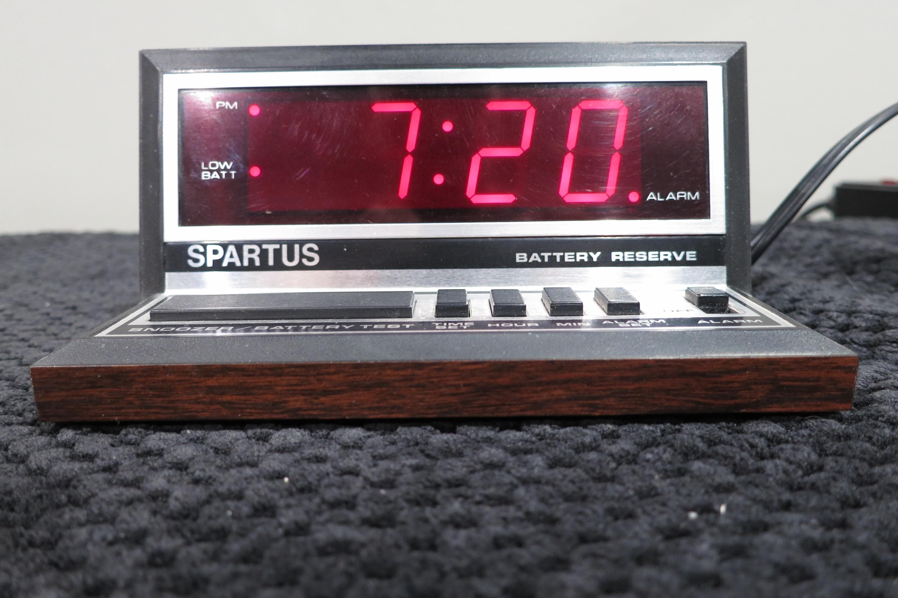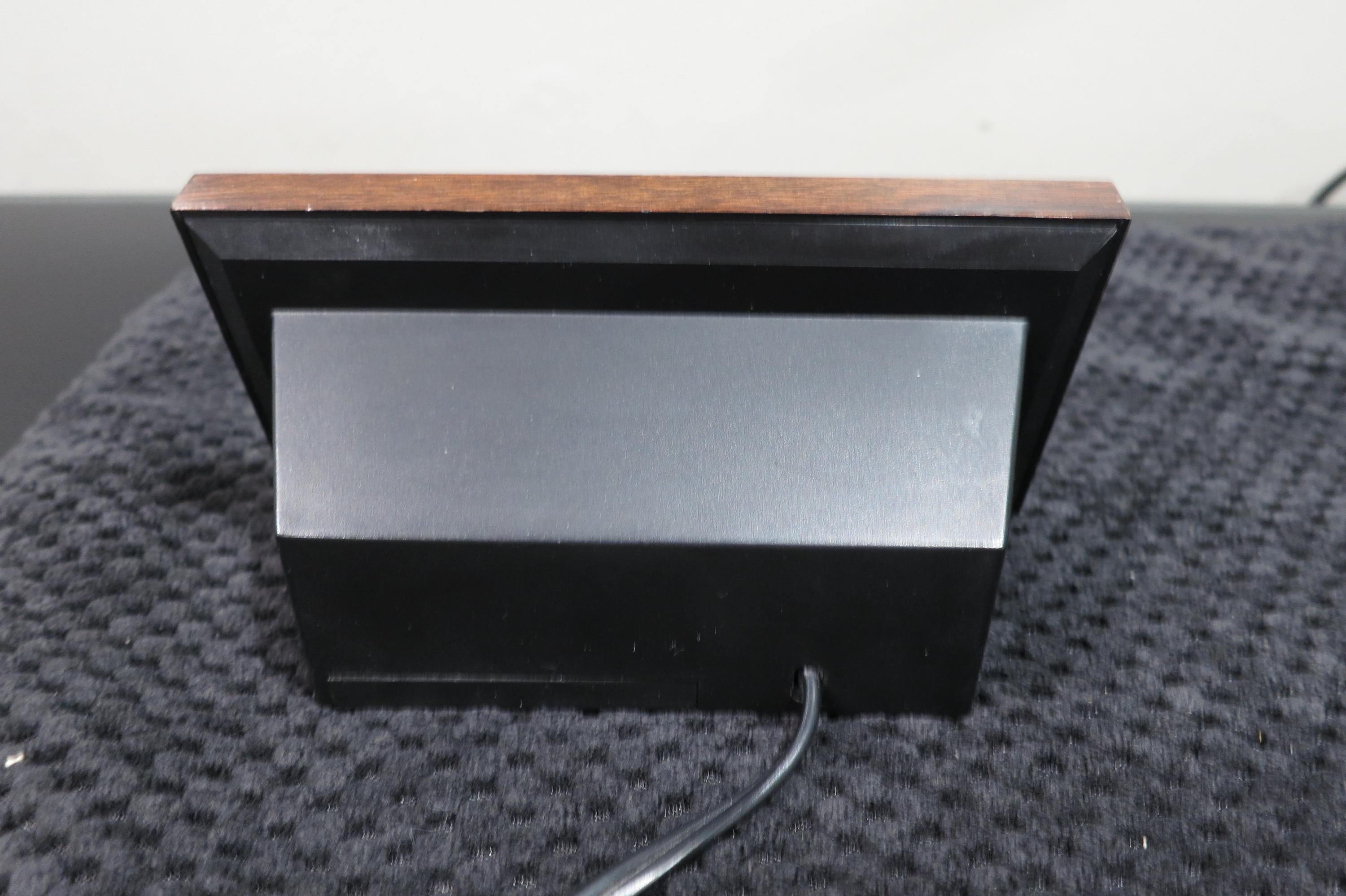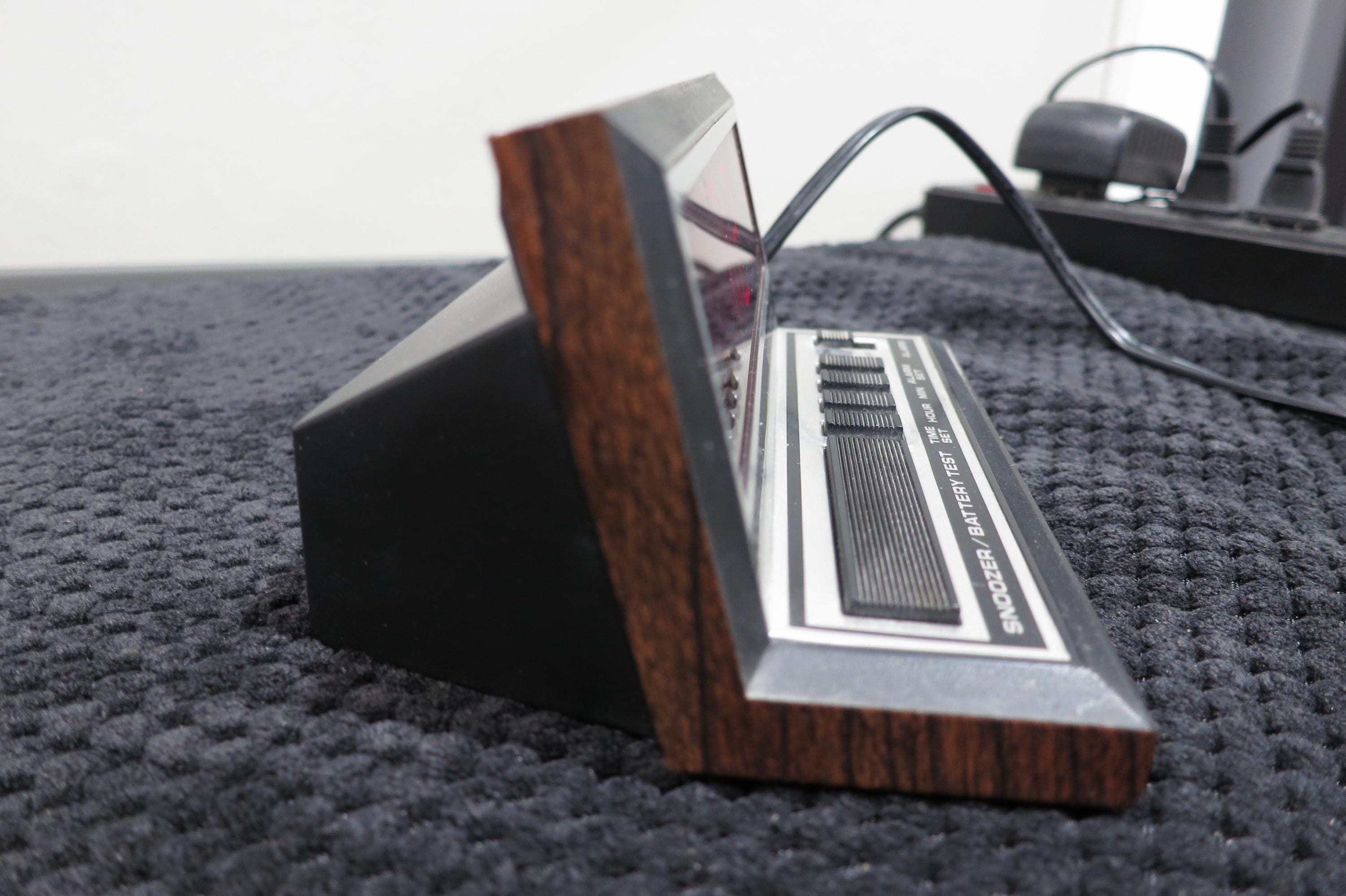 Huge red numbers you can't miss! Case is black and faux wood.