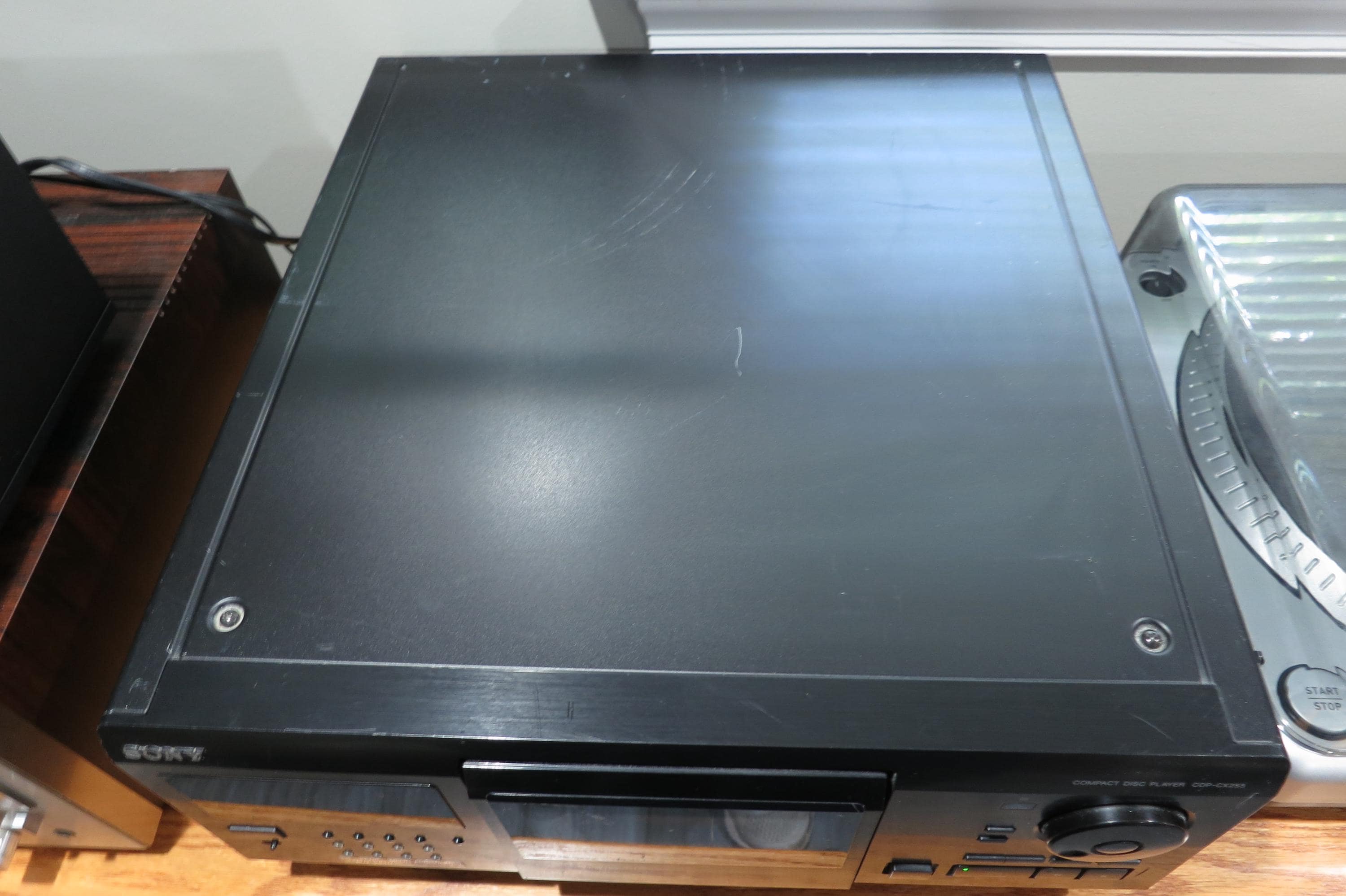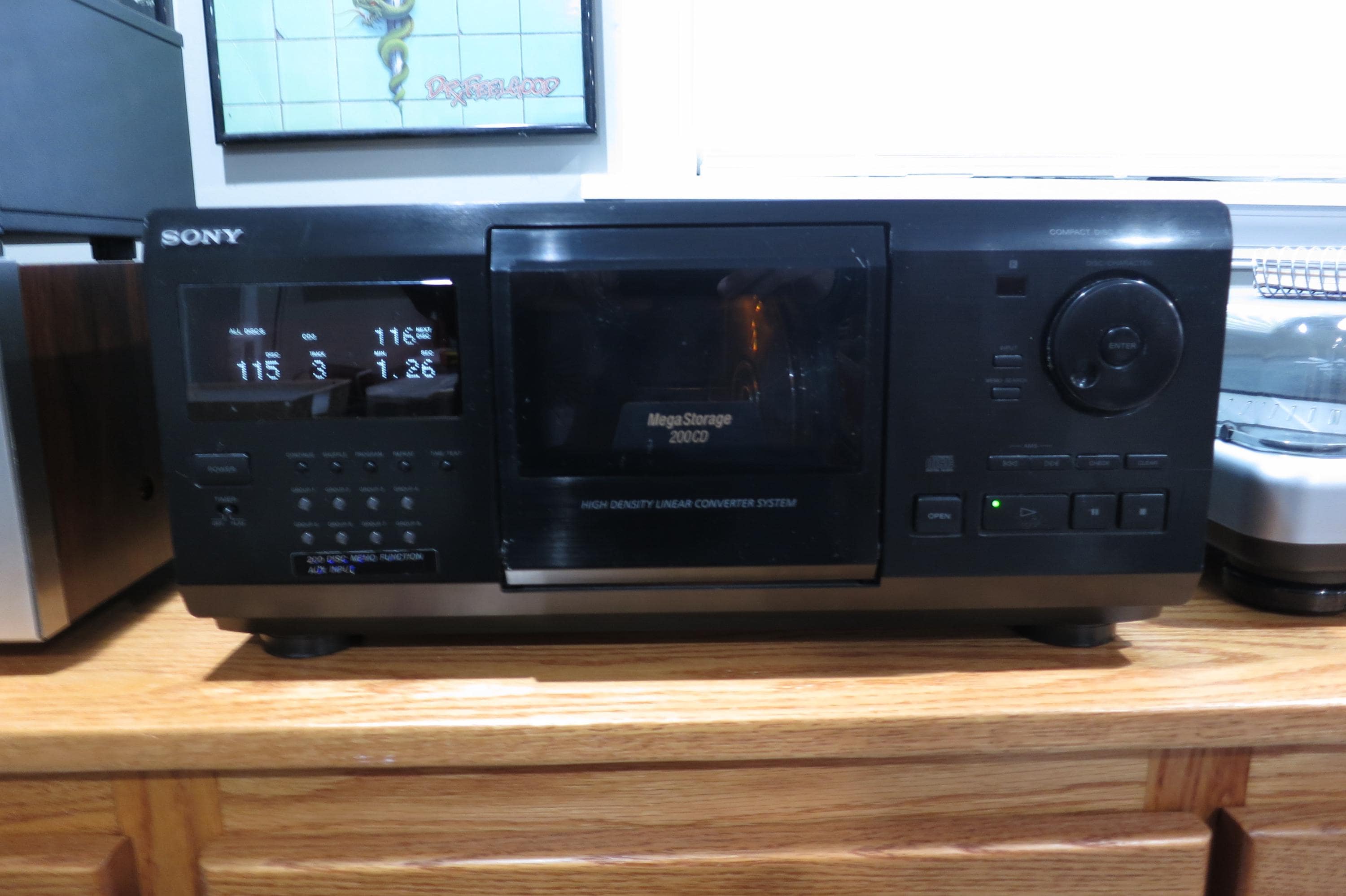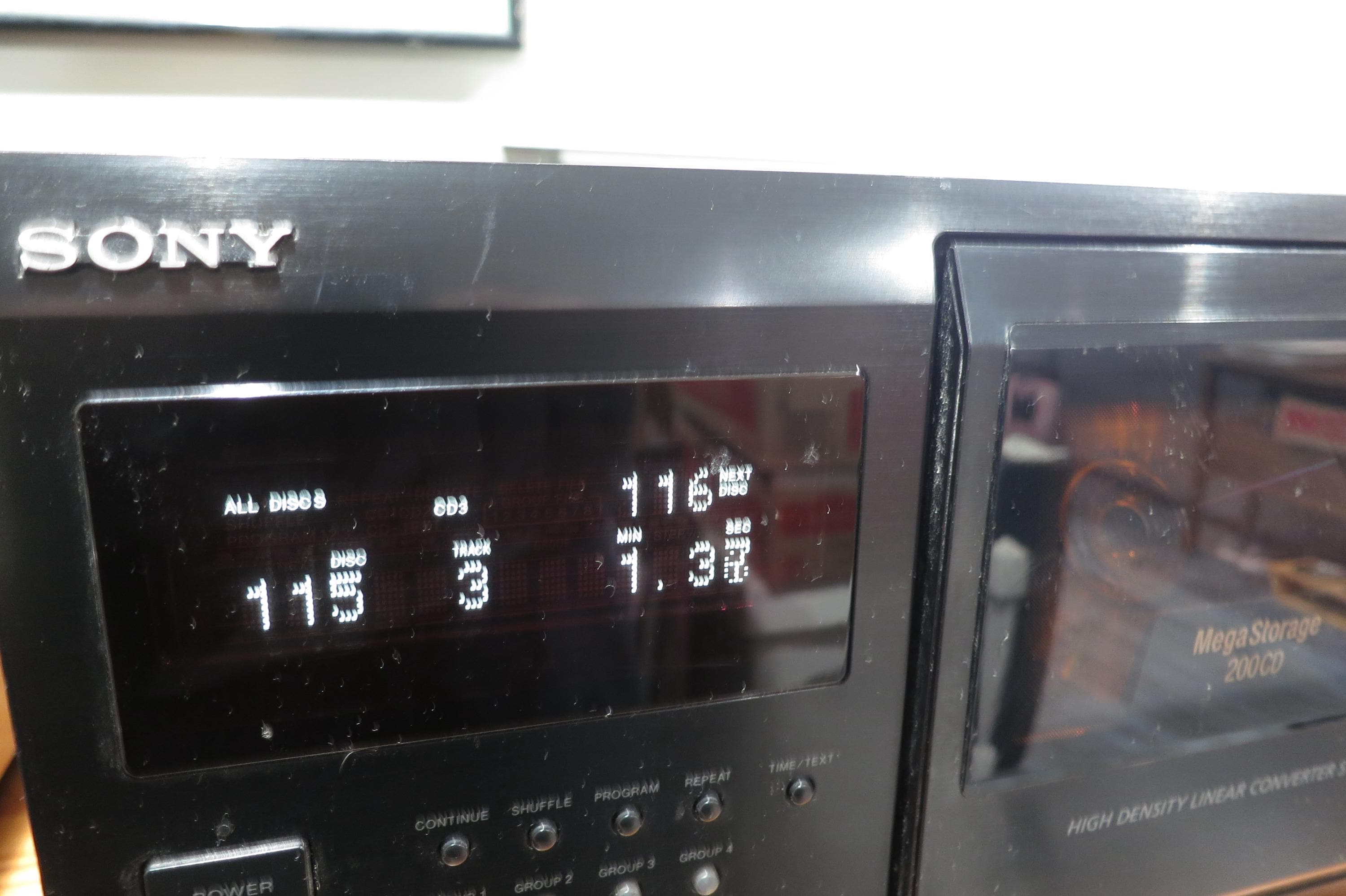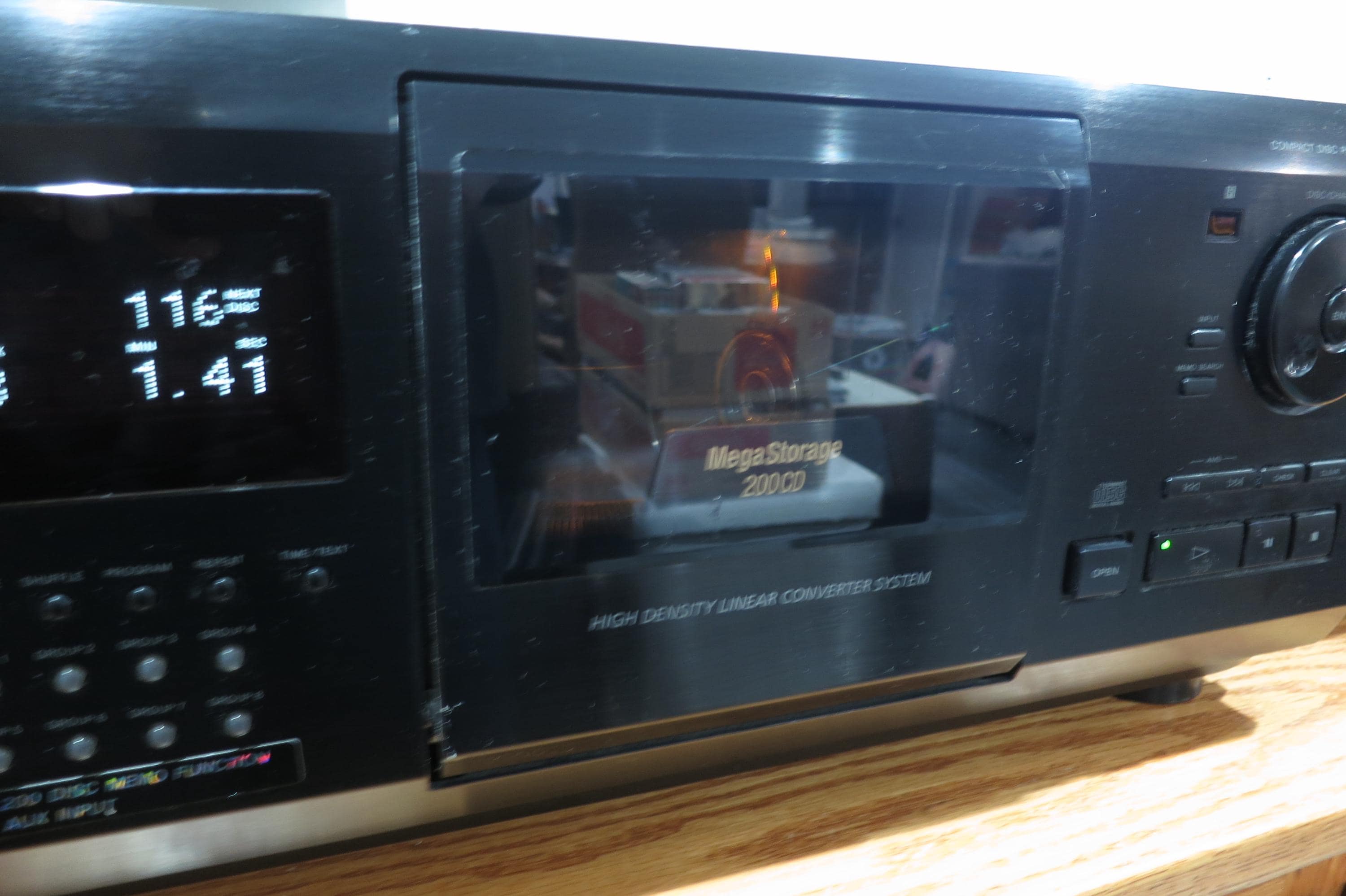 This Mini Jukebox features a digital display, 8 group settings, cd text with Name Search, 200 disc Holder. It works perfect. It measures 17 inches wide, 18 1/4 inches deep and 7 3/4 inches tall. Unpack and play!! Never need to change your cd's again!! Has a few small scratches on the top. As you can see in the pictures, we are currently using this in our shop! We offer free shipping on all orders over 35 dollars.