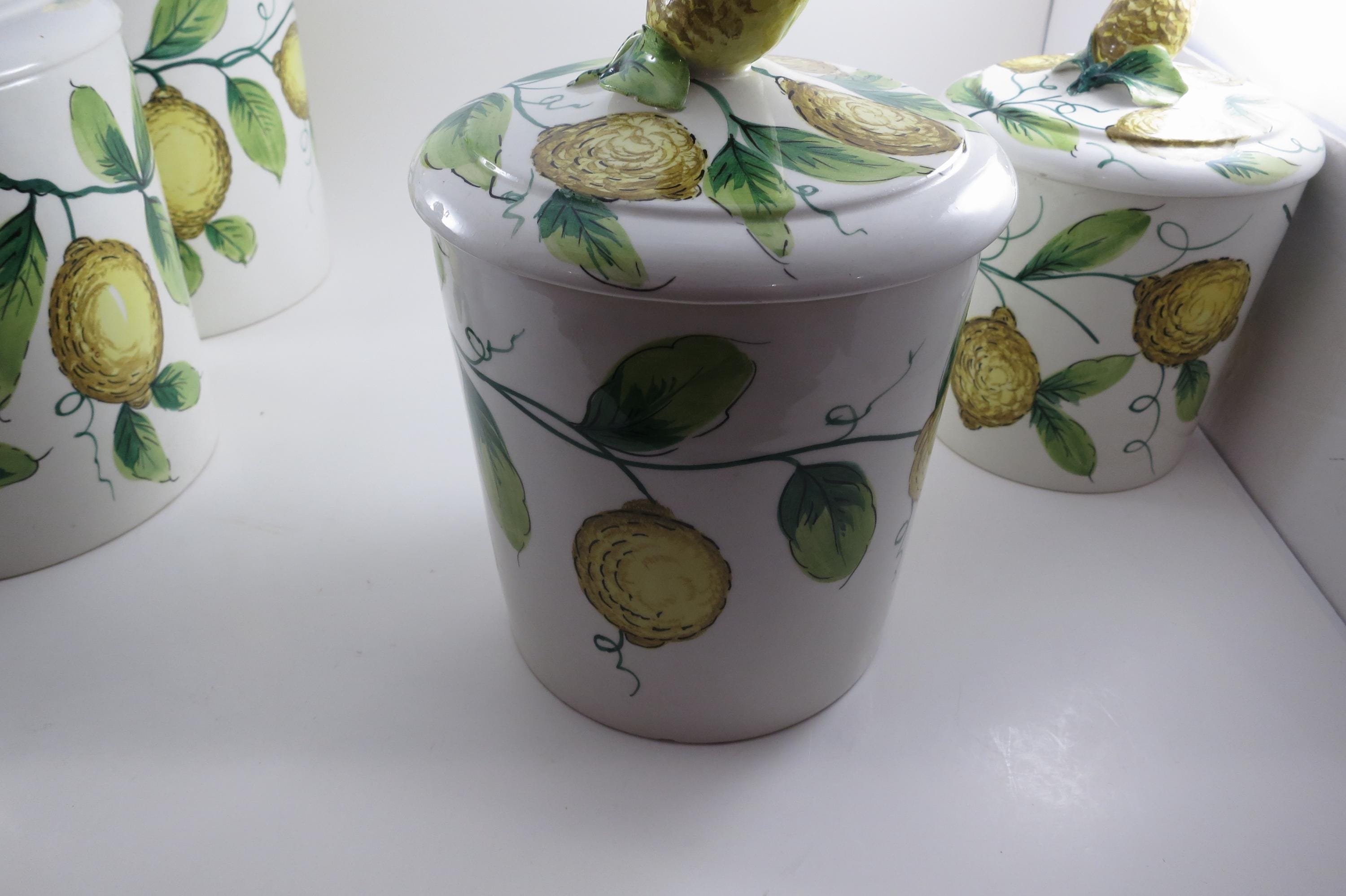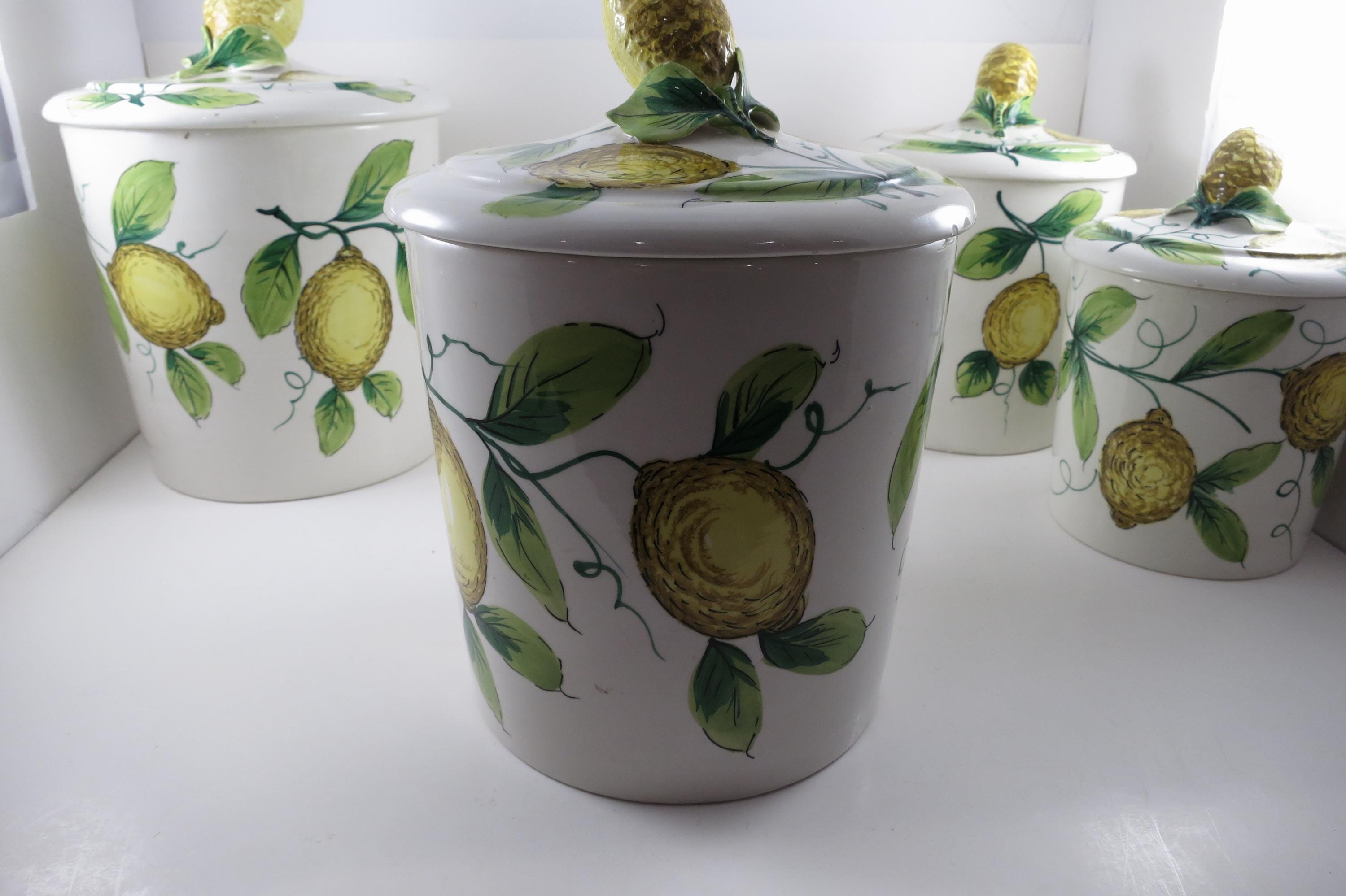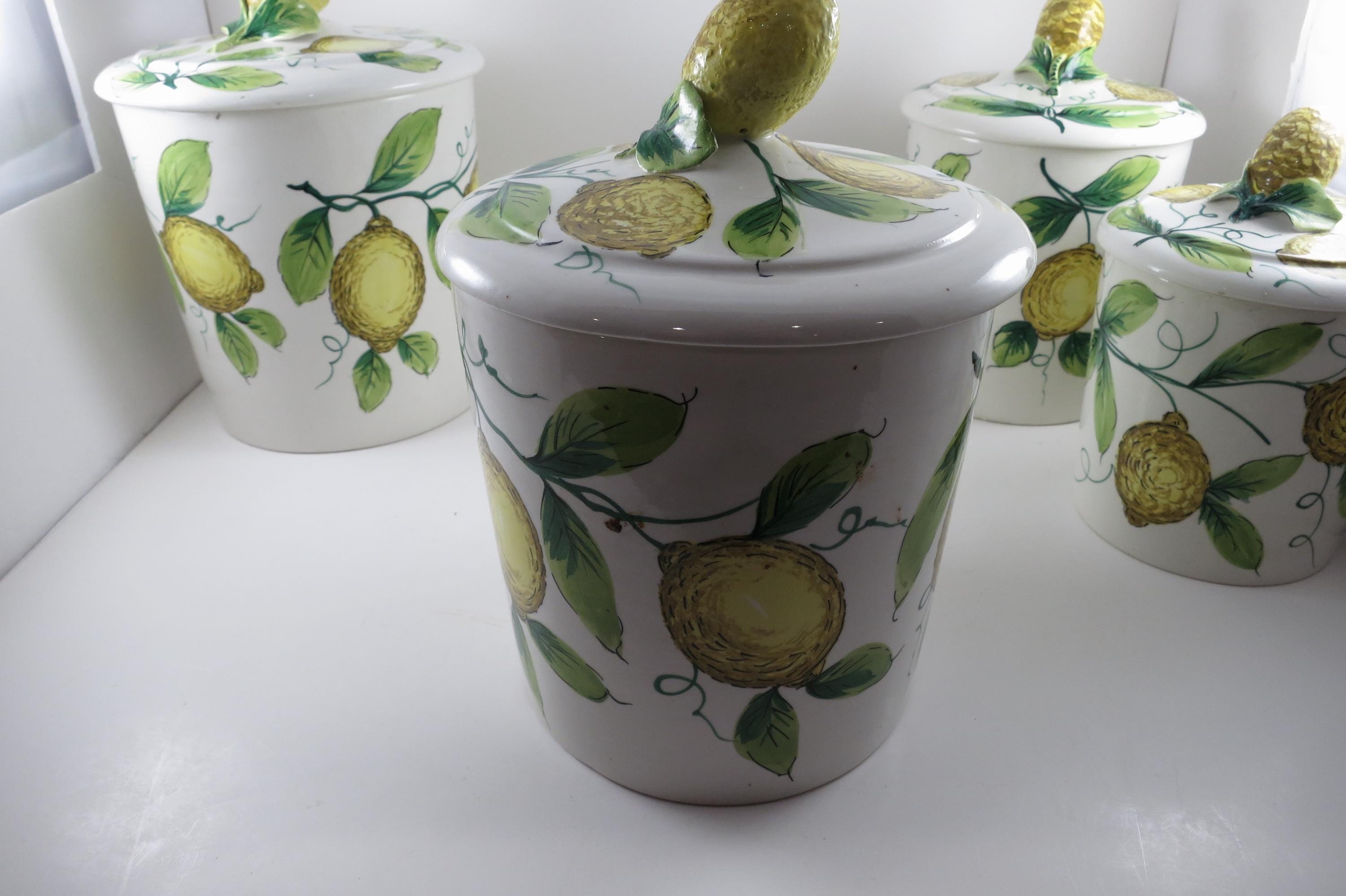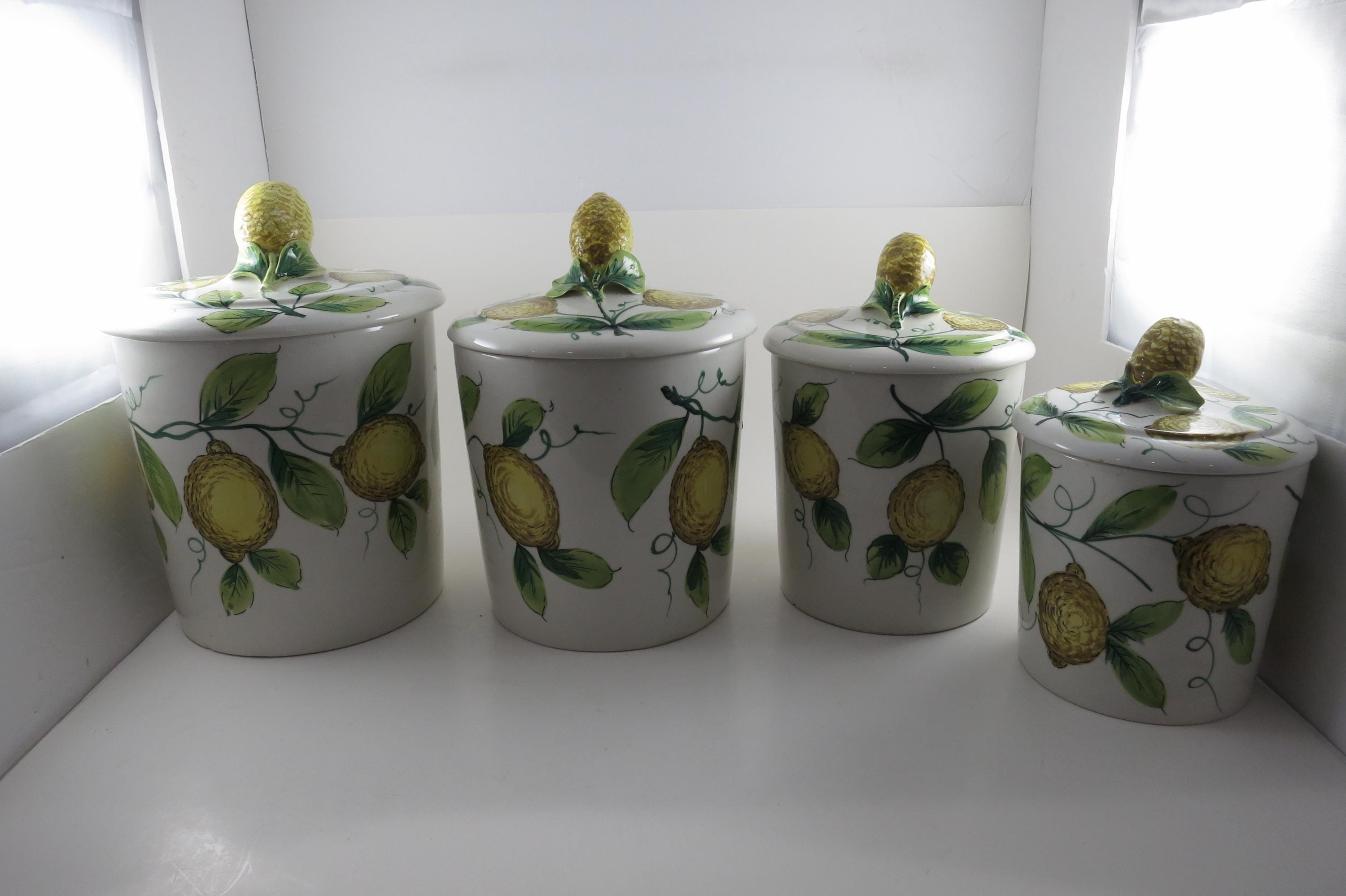 Vintage Ceramic Italian 4 Piece Canister Set Acorns Green Yellow.