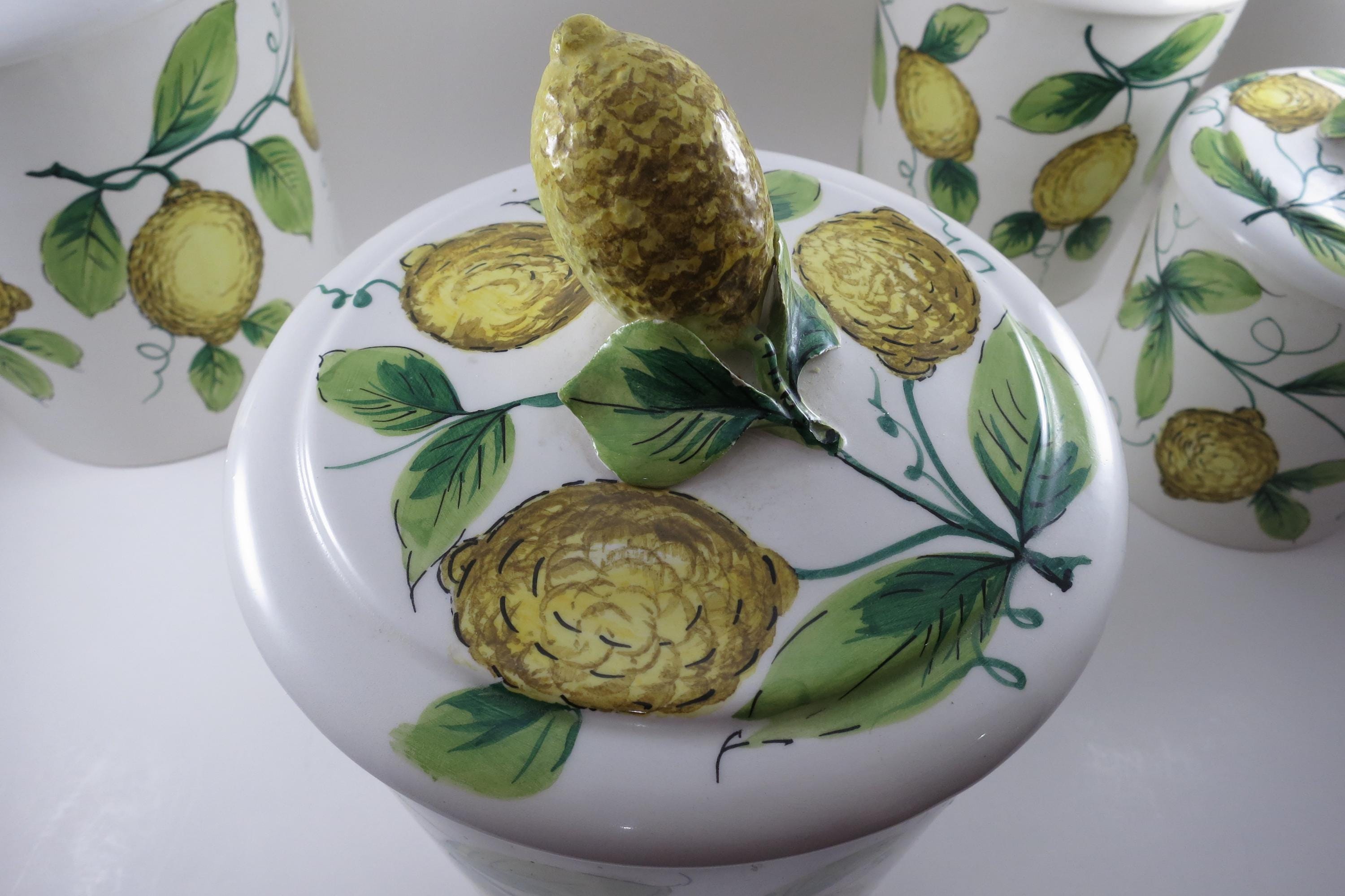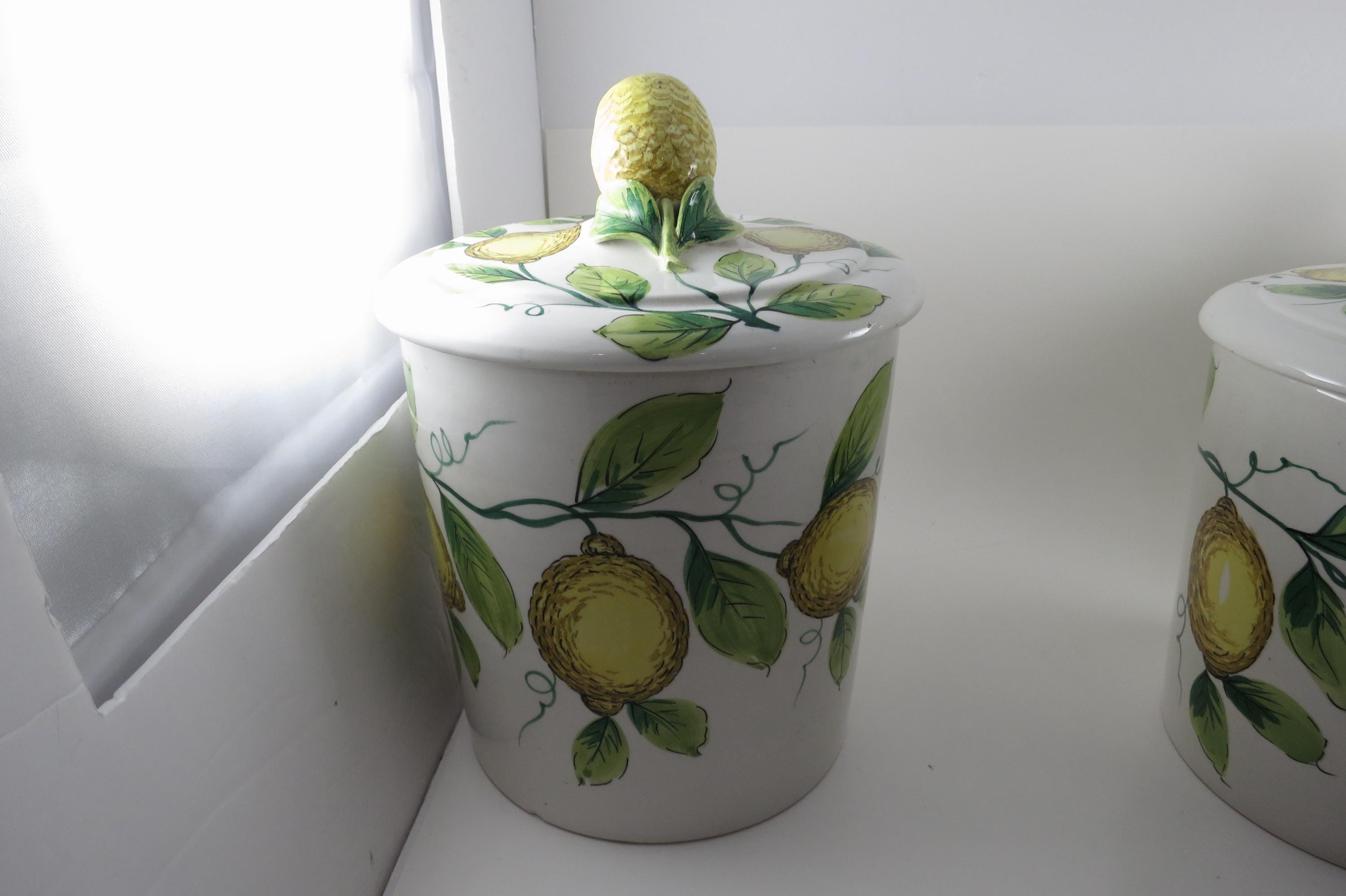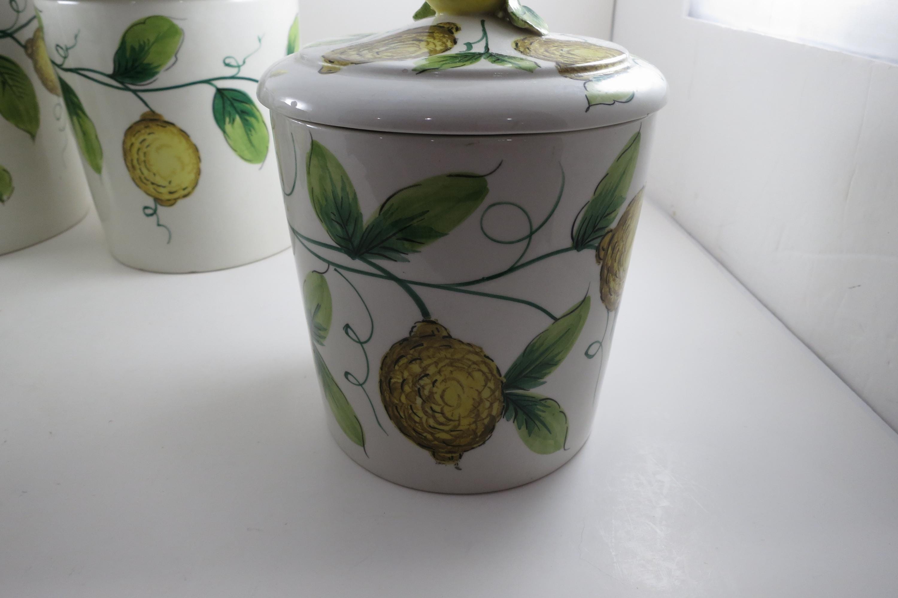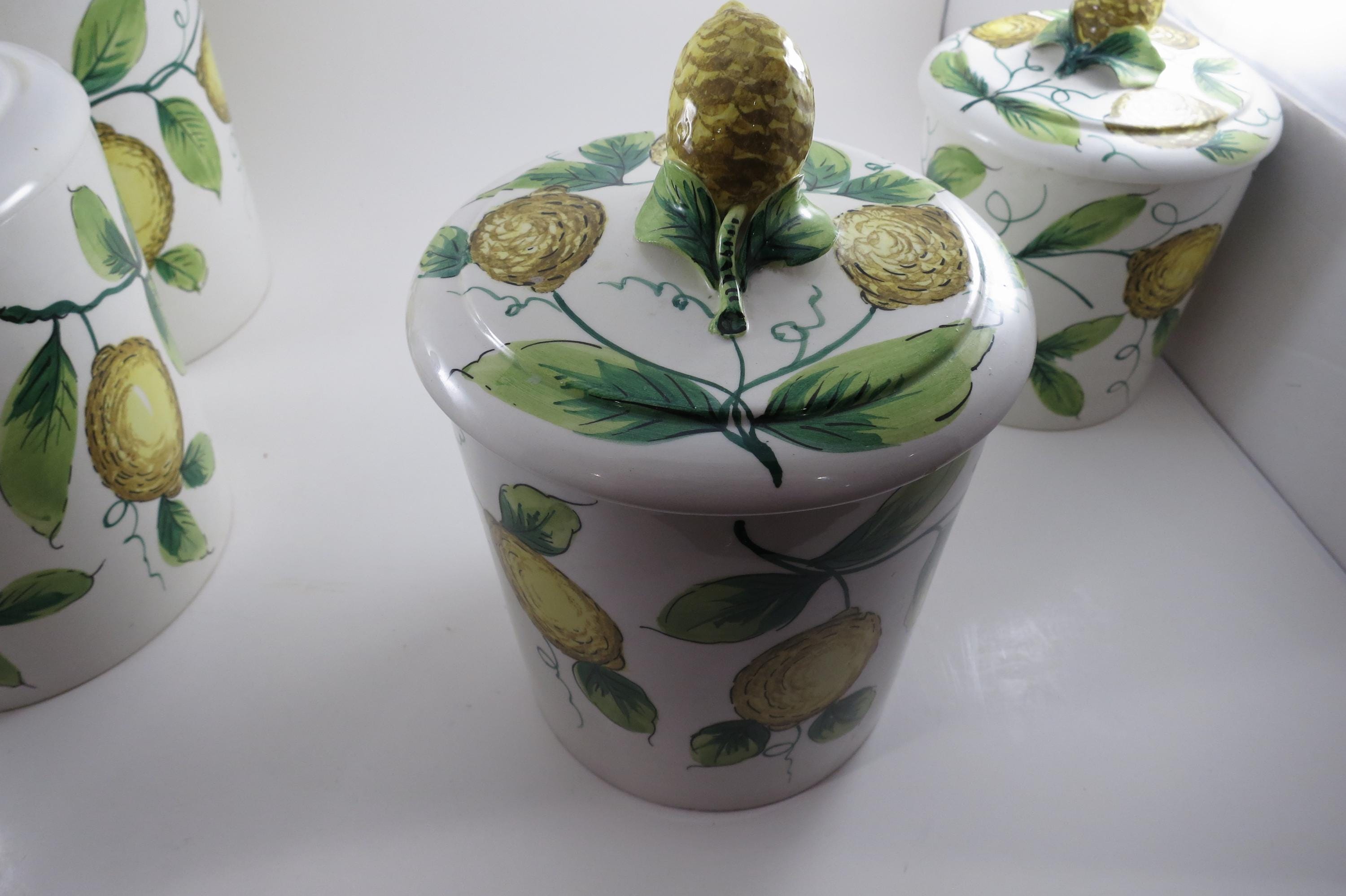 Vintage Ceramic Italian 4 Piece Canister Set Acorns Green Yellow.