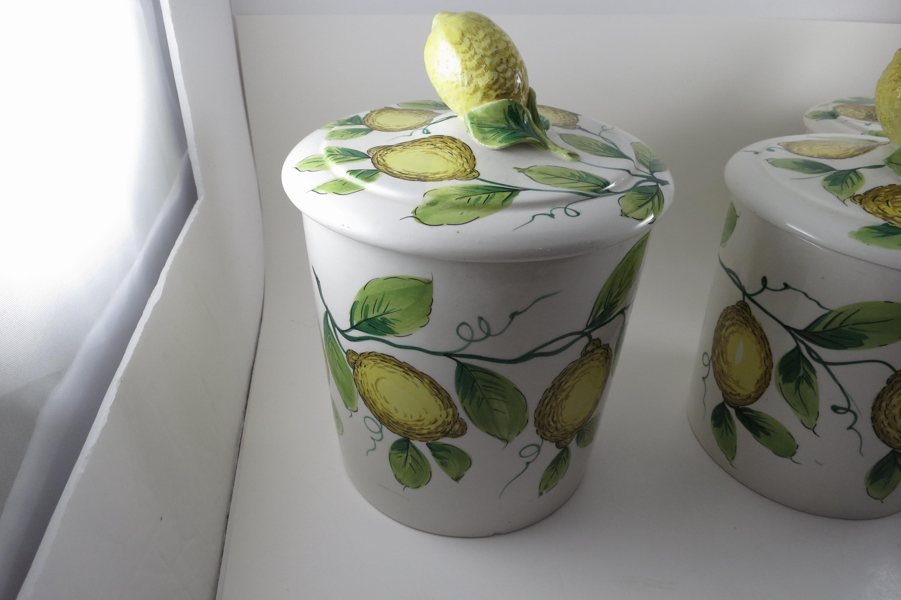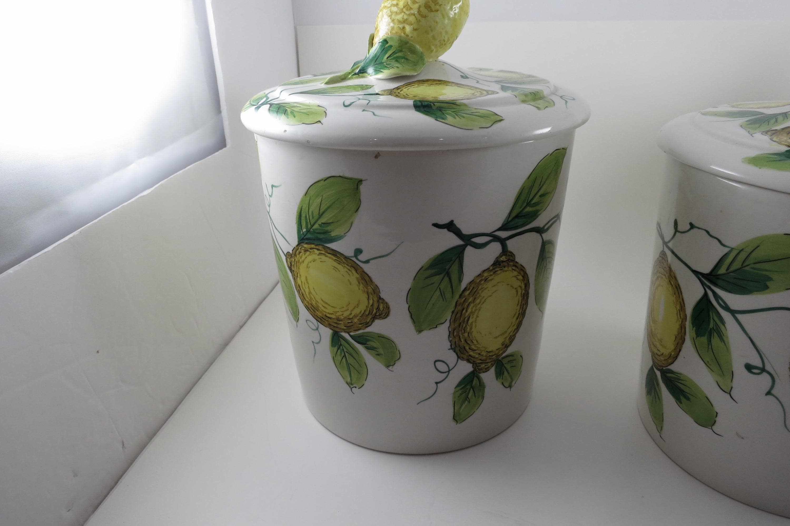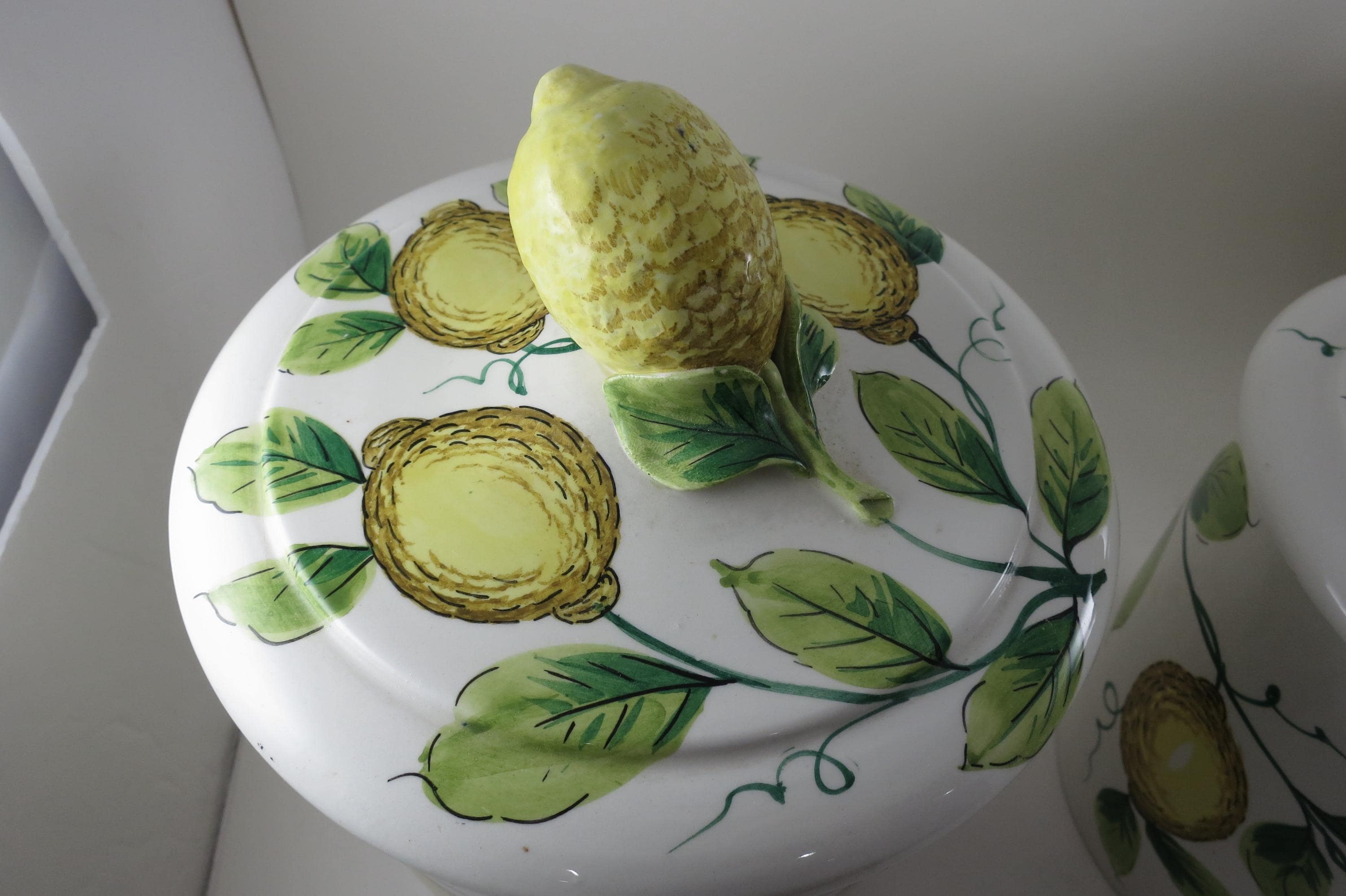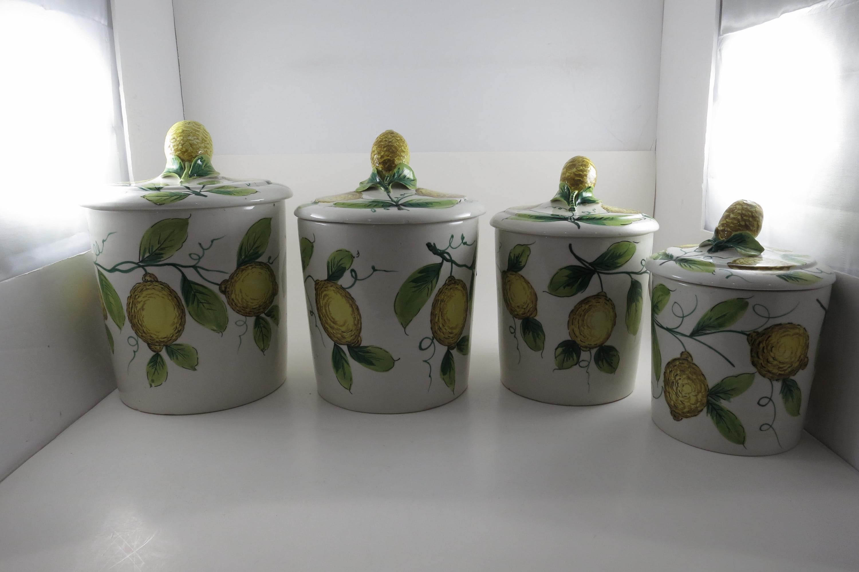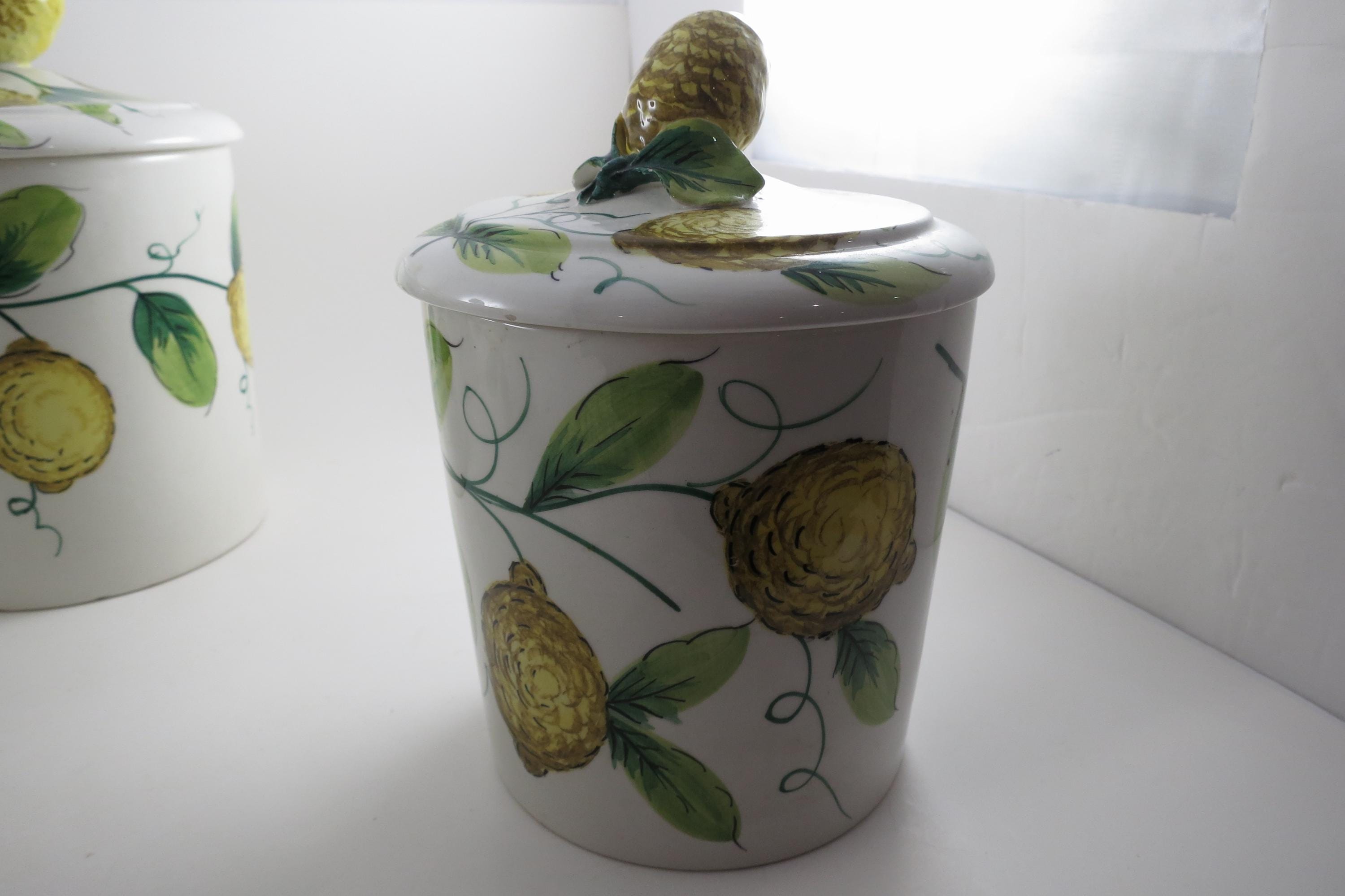 Vintage Ceramic Italian 4 Piece Canister Set Acorns Green Yellow.