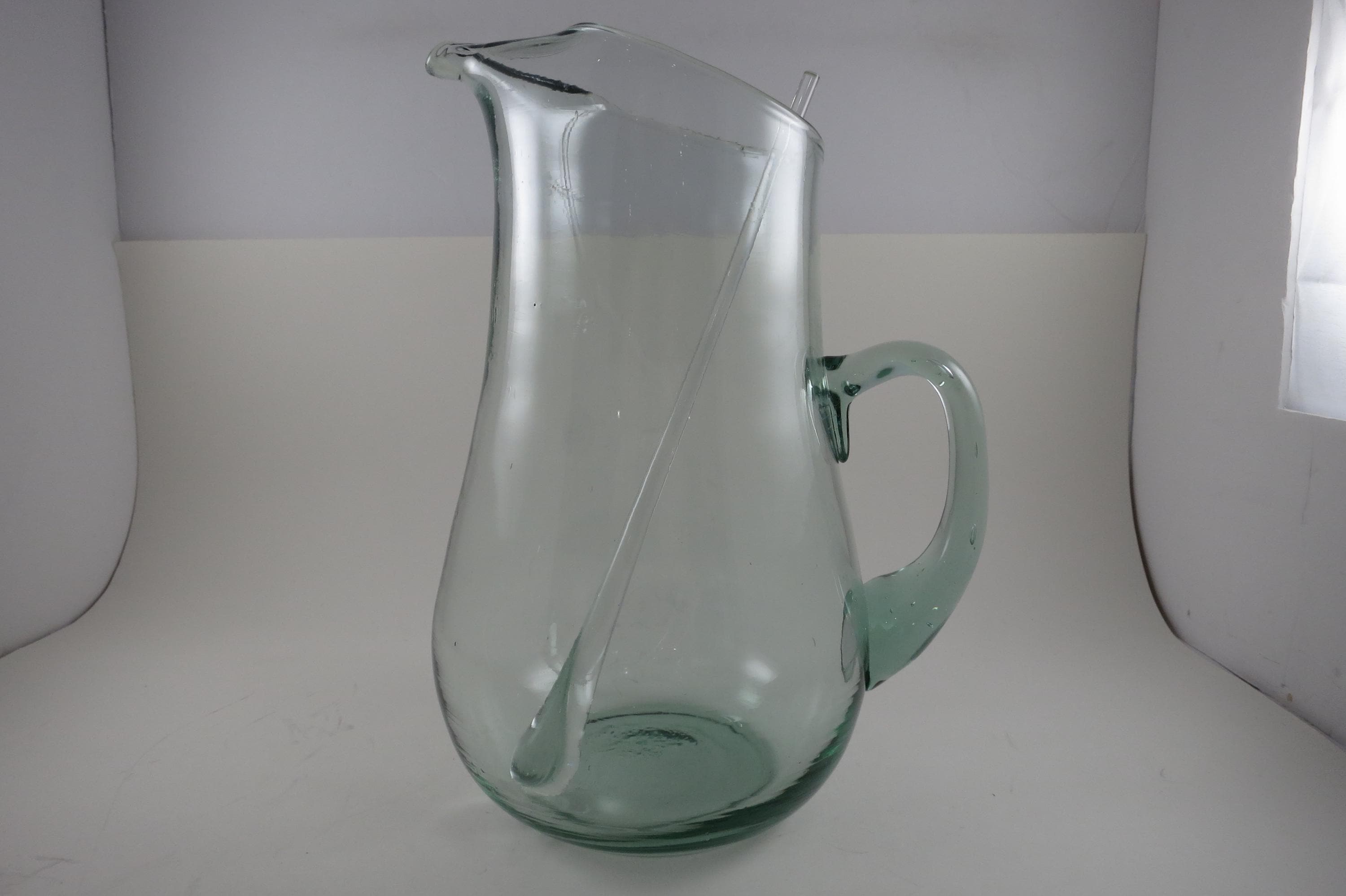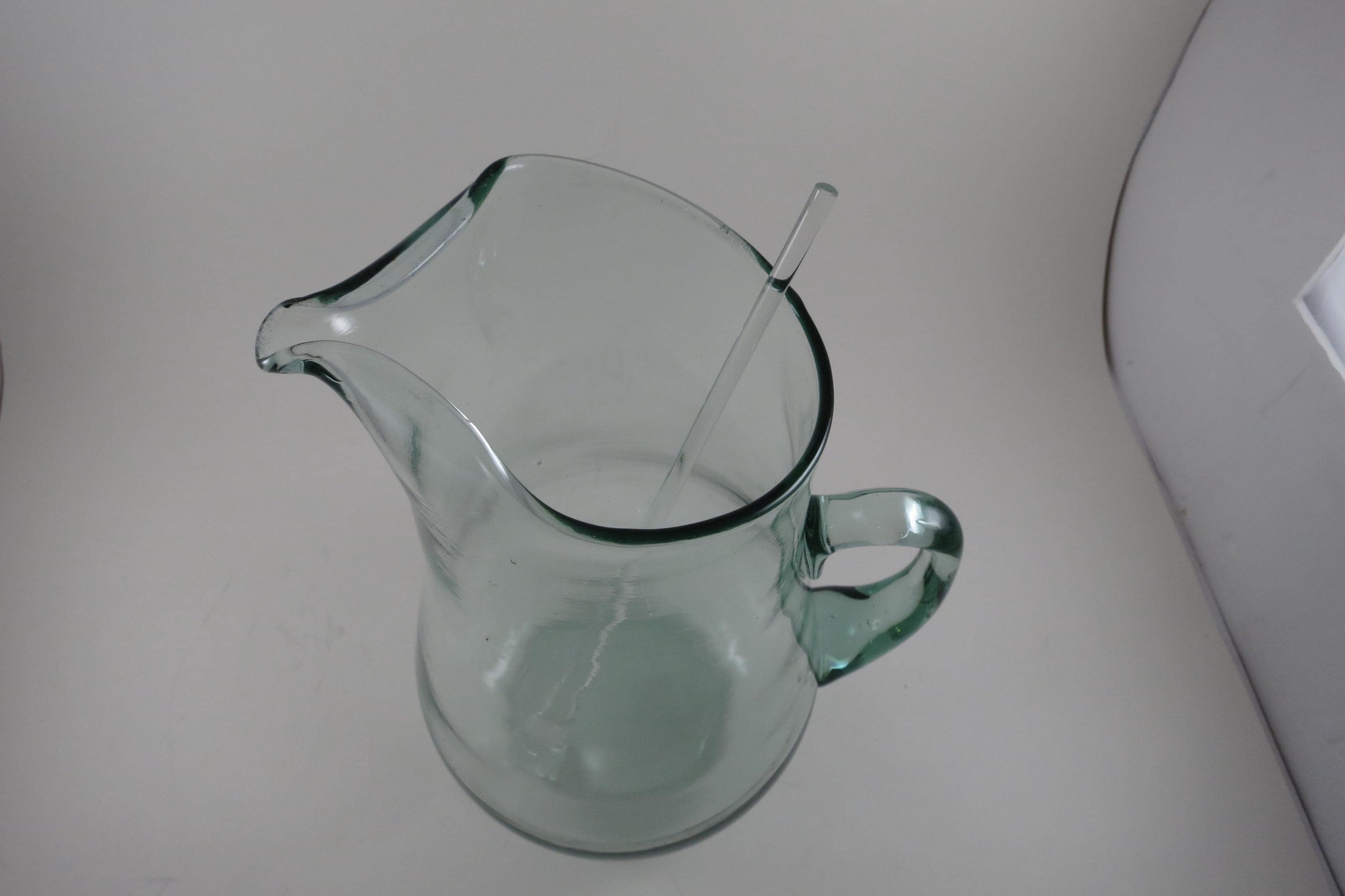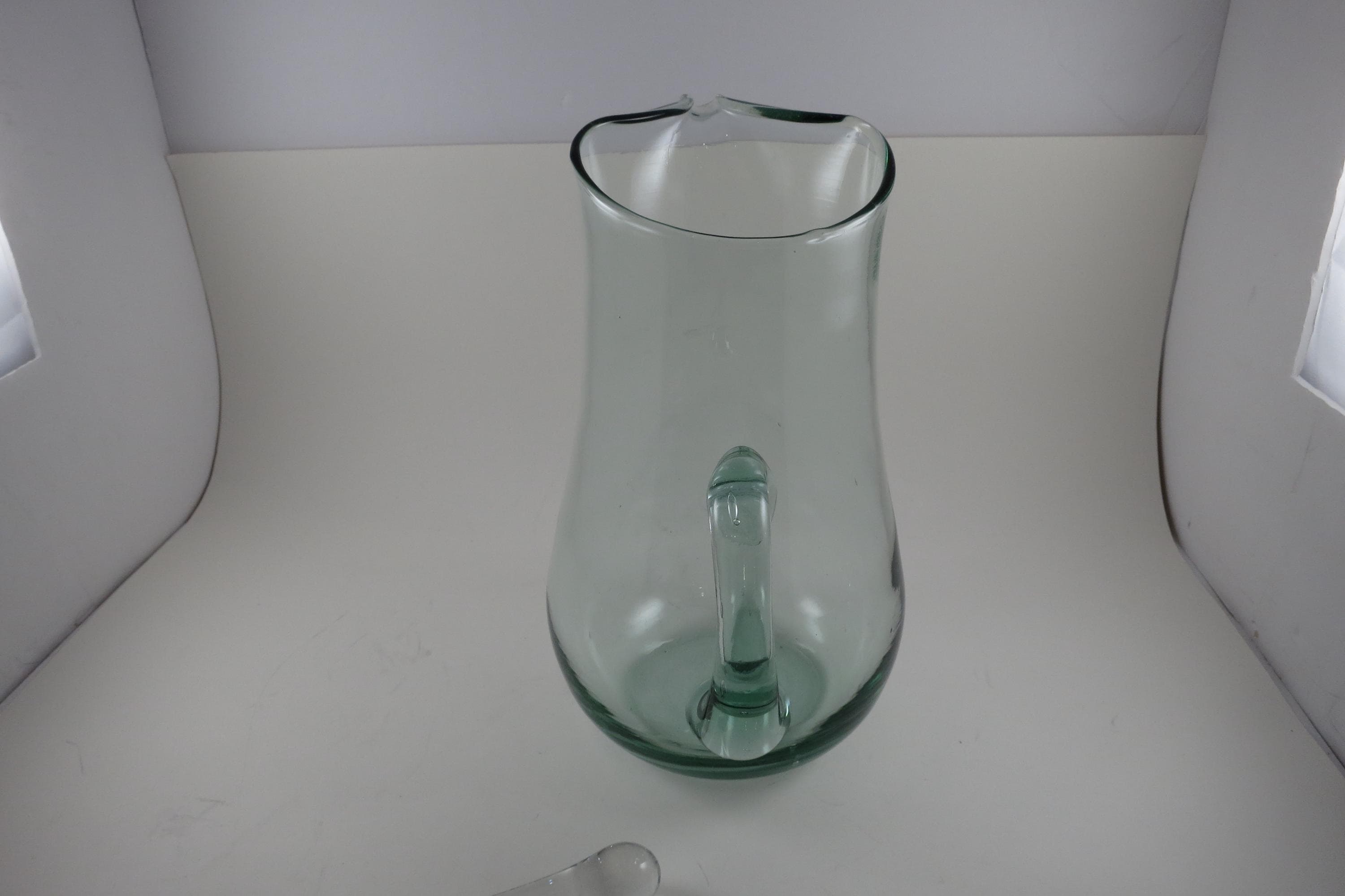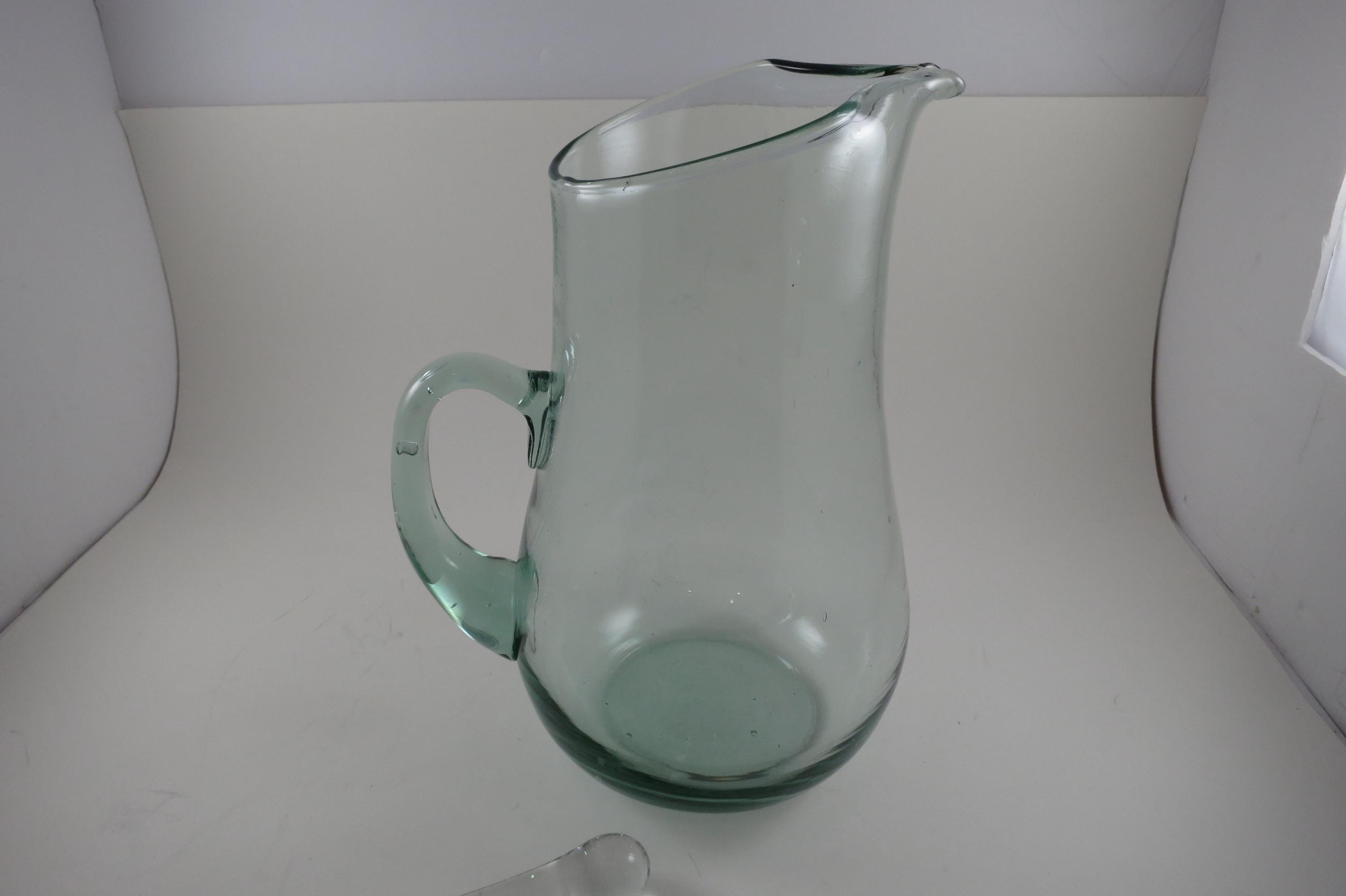 Hand Blown Aqua Glass Large Water Tea Pitcher with Stirrer Applied Handle.