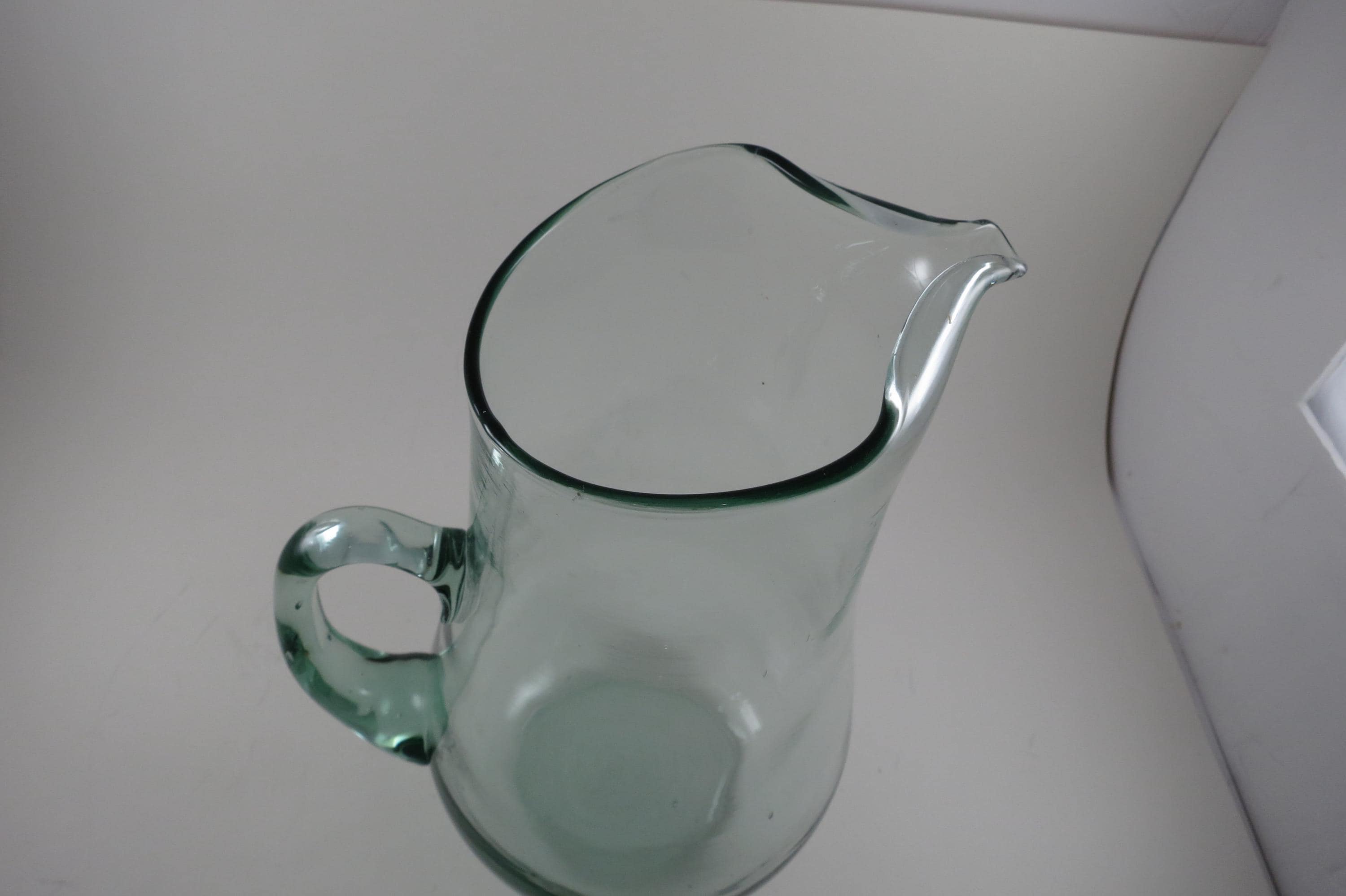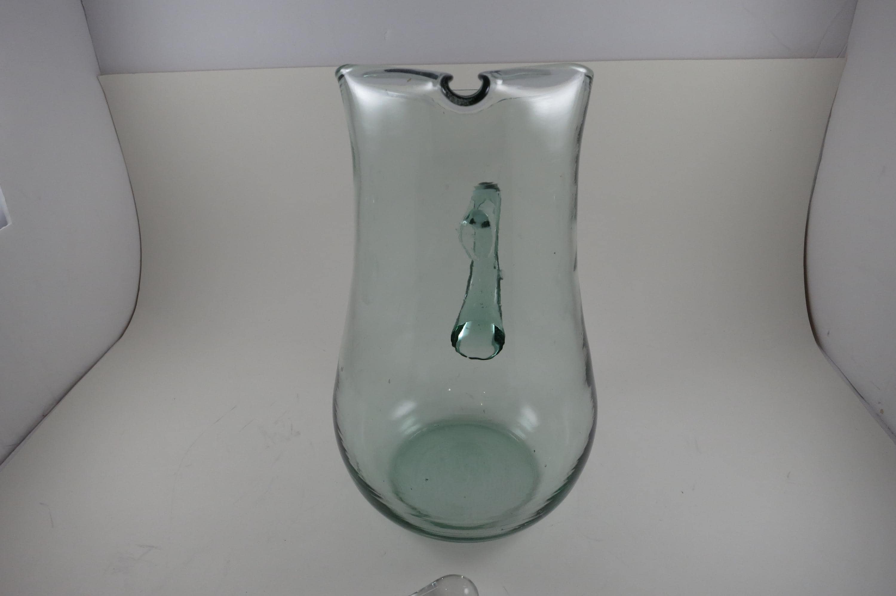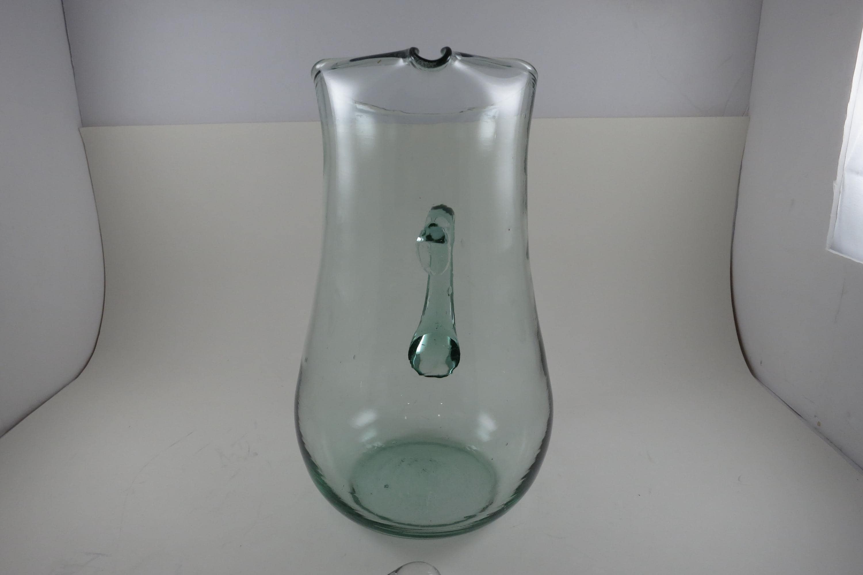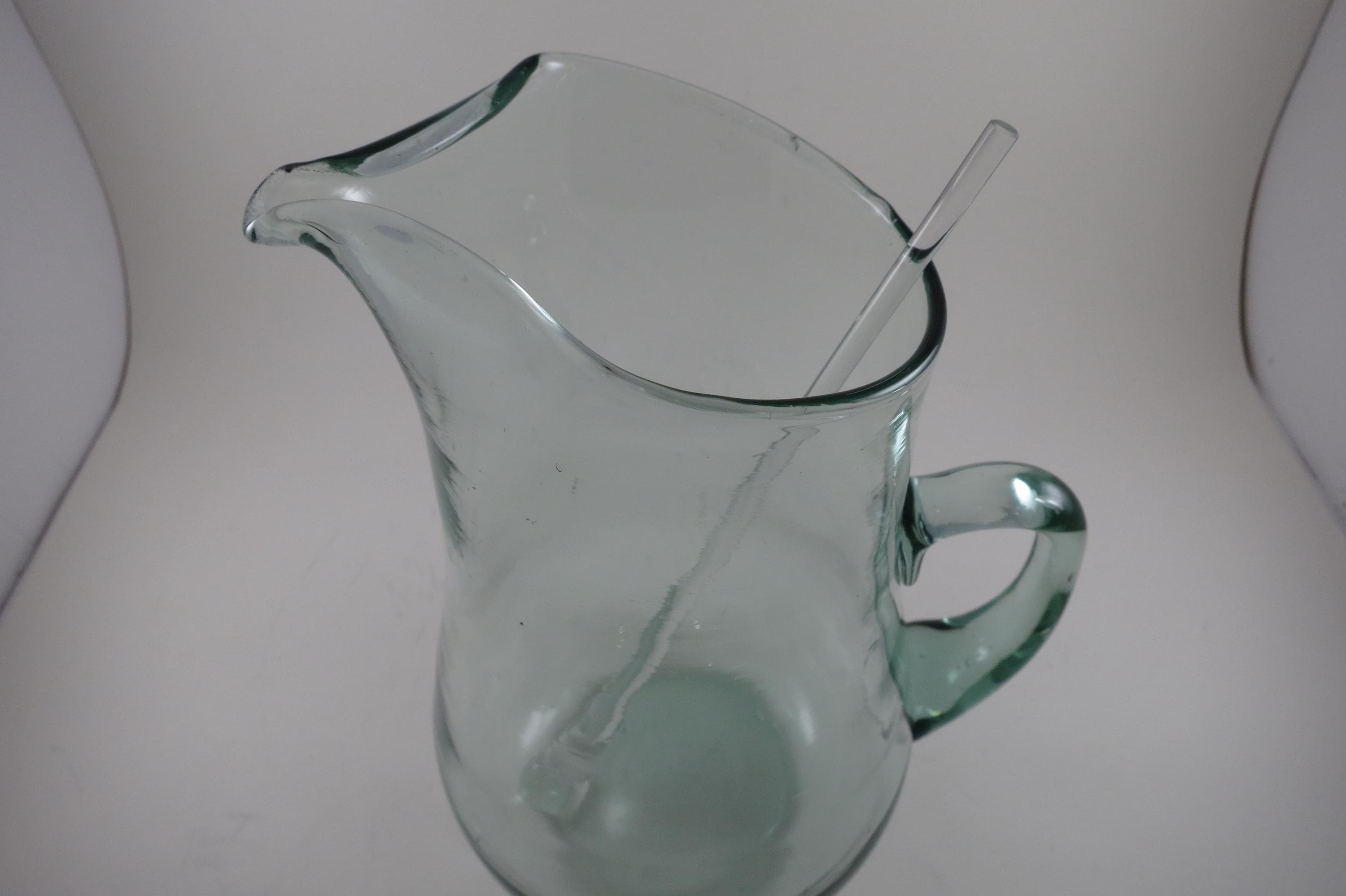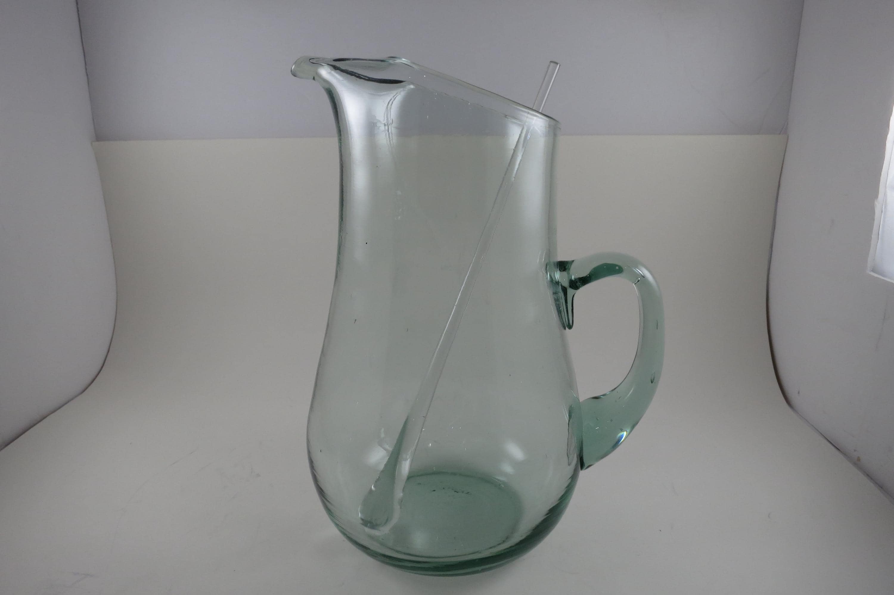 Hand Blown Aqua Glass Large Water Tea Pitcher with Stirrer Applied Handle.